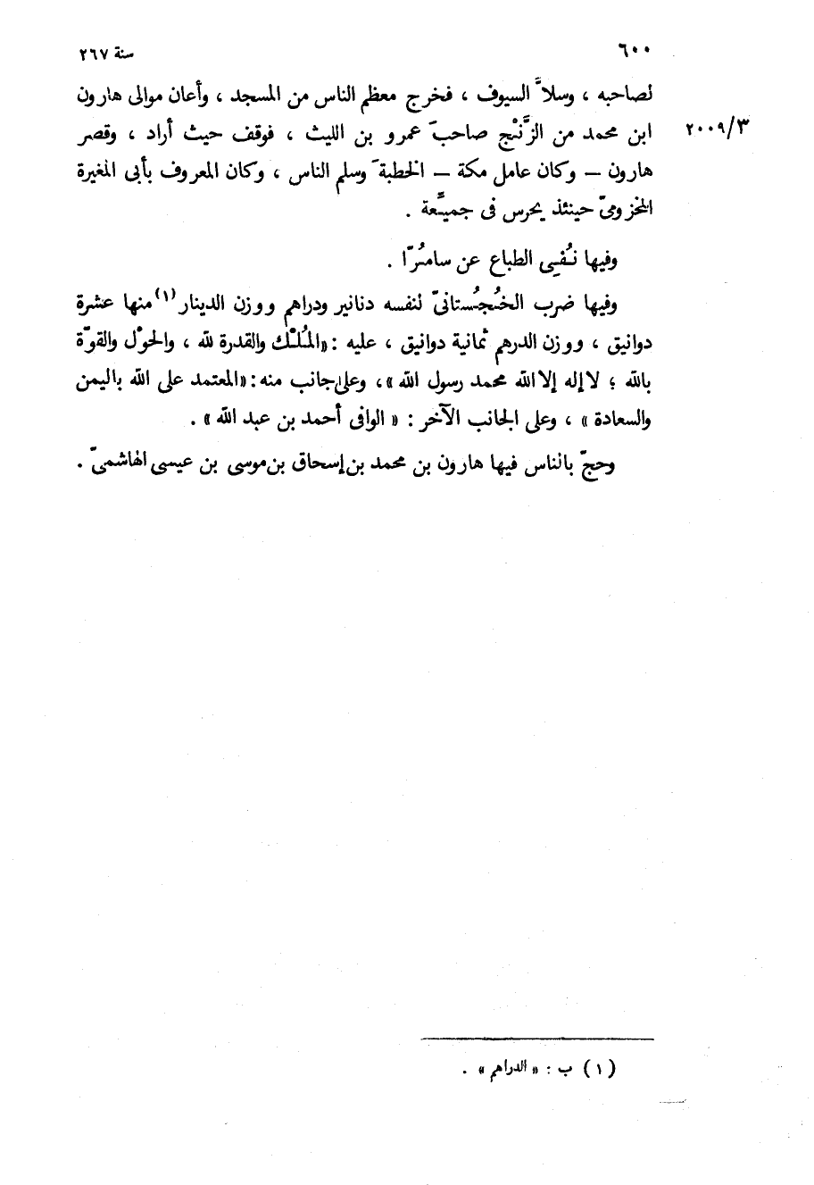 وفيها ضرب الخجستاني لنفسه دنانير ودراهم ووزن الدينار منها عشرة دوانيق، ووزن الدرهم ثمانية دوانيق، عليه: الملك والقدرة لله، والحول والقوة بالله، لا إله الا الله محمد رسول الله، وعلى جانب منه: المعتمد على الله باليمن والسعادة، وعلى الجانب الآخر: الوافي أحمد بن عبد الله.