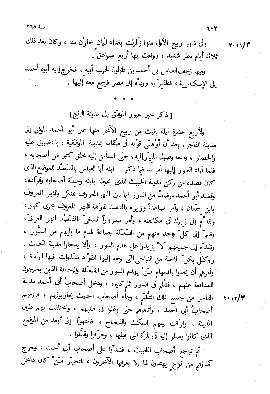 ولأربع عشرة ليلة بقيت من ربيع الآخر منها عبر أبو أحمد الموفق إلى مدينة الفاجر، بعد أن أوهى قوته في مقامه بمدينه الموفقيه، بالتضييق عليه والحصار، ومنعه وصول المير إليه، حتى استأمن إليه خلق كثير من أصحابه، فلما أراد العبور إليها أمر- فيما ذكر- ابنه أبا العباس بالقصد للموضع الذي كان قصده من ركن مدينة الخبيث الذي يحوطه بابنه وجلة أصحابه وقواده، وقصد أبو أحمد موضعا من السور فيما بين النهر المعروف بمنكى والنهر المعروف بابن سمعان، وأمر صاعدا وزيره بالقصد لفوهة النهر المعروف بجري كور، وتقدم إلى زيرك في مكانفته، وأمر مسرورا البلخي بالقصد النهر الغربي، وضم إلى كل واحد منهم من الفعلة جماعة لهدم ما يليهم من السور، وتقدم إلى جميعهم ألا يزيدوا على هدم السور، وألا يدخلوا مدينة الخبيث.