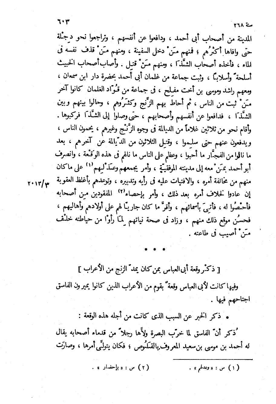 وأقام نحو من ثلاثين غلاما من الديالمة في وجوه الزنج وغيرهم، يحمون الناس، ويدفعون عنهم حتى سلموا، وقتل الثلاثون من الديالمة عن آخرهم، بعد ما نالوا من الفجار ما أحبوا، وعظم على الناس ما نالهم في هذه الوقعة، وانصرف ابو احمد بمن معه الى مدينته الموفقيه، وامر يجمعهم وعذلهم على ما كان منهم من مخالفة أمره، والافتيات عليه في رأيه وتدبيره، وتوعدهم بأغلظ العقوبة إن عادوا لخلاف أمره بعد ذلك، وامر بإحصاء المفقودين من اصحابه فاحصوا له، فأتي بأسمائهم، وأقر ما كان جاريا لهم على أولادهم وأهاليهم، فحسن موقع ذلك منهم، وزاد في صحة نياتهم لما رأوا من حياطته خلف من أصيب في طاعته.
