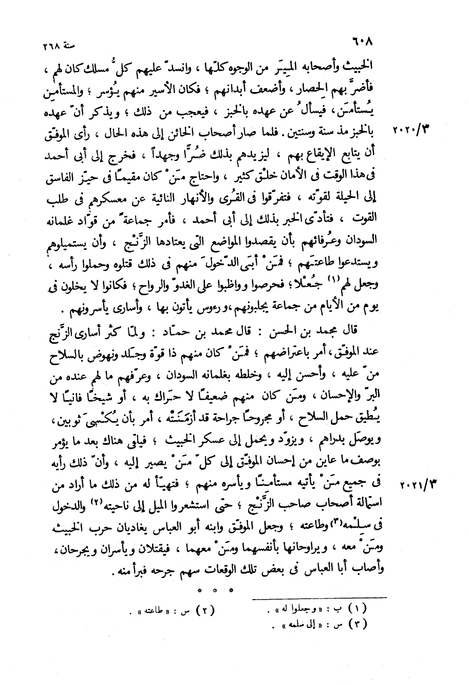 قال محمد بن الحسن: قال محمد بن حماد: ولما كثر أسارى الزنج عند الموفق، أمر باعتراضهم، فمن كان منهم ذا قوة وجلد ونهوض بالسلاح من عليه، وأحسن إليه، وخلطه بغلمانه السودان، وعرفهم ما لهم عنده من البر والإحسان، ومن كان منهم ضعيفا لا حراك به، أو شيخا فانيا لا يطيق حمل السلاح، أو مجروحا جراحة قد أزمنته، أمر بأن يكسى ثوبين، ويوصل بدراهم، ويزود ويحمل إلى عسكر الخبيث، فيلقى هناك بعد ما يؤمر بوصف ما عاين من إحسان الموفق إلى كل من يصير إليه، وأن ذلك رأيه في جميع من يأتيه مستأمنا ويأسره منهم، فتهيأ له من ذلك ما أراد من استمالة أصحاب صاحب الزنج، حتى استشعروا الميل إلى ناحيته والدخول في سلمه وطاعته، وجعل الموفق وابنه أبو العباس يغاديان حرب الخبيثة ومن معه، ويراوحانها بأنفسهما ومن معهما، فيقتلان ويأسران ويجرحان، وأصاب أبا العباس في بعض تلك الوقعات سهم جرحه فبرأ منه.