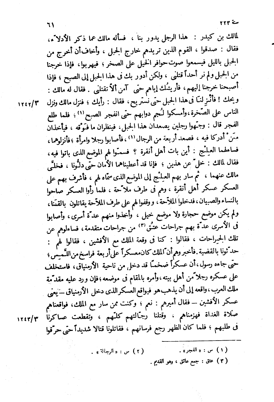 ويحك! فأنزلنا في هذا الجبل حتى نستريح، فقال: رأيك، فنزل مالك ونزل الناس على الصخرة، وأمسكوا لجم دوابهم حتى انفجر الصبح، فلما طلع الفجر قال: وجهوا رجلين يصعدان هذا الجبل، فينظران ما فوقه، فيأخذان من أدركا فيه، فصعد أربعة من الرجال، فأصابوا رجلا وامرأة، فانزلوهما، فساء لهما العلج: أين بات أهل انقرة؟ فسموا لهم الموضع الذي باتوا فيه، فقال لمالك: خل عن هذين، فإنا قد أعطيناهما الأمان حتى دلونا، فخلى مالك عنهما، ثم سار بهم العلج إلى الموضع الذي سماه لهم، فأشرف بهم على العسكر عسكر أهل أنقرة، وهم في طرف ملاحة، فلما رأوا العسكر صاحوا بالنساء والصبيان، فدخلوا الملاحة، ووقفوا لهم على طرف الملاحة يقاتلون بالقنا، ولم يكن موضع حجارة ولا موضع خيل، وأخذوا منهم عدة أسرى، وأصابوا في الأسرى عدة بهم جراحات عتق من جراحات متقدمة، فساءلوهم عن تلك الجراحات، فقالوا: كنا في وقعة الملك مع الأفشين، فقالوا لهم: