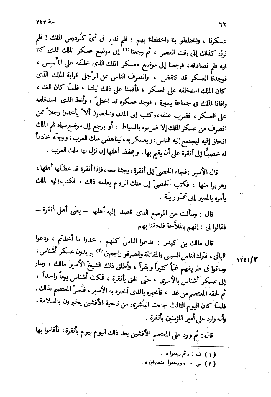 عسكرنا، واختلطوا بنا واختلطنا بهم، فلم ندر في أي كردوس الملك! فلم نزل كذلك إلى وقت العصر، ثم رجعنا إلى موضع عسكر الملك الذي كنا فيه فلم نصادفه، فرجعنا إلى موضع معسكر الملك الذي خلفه على اللمس، فوجدنا العسكر قد انتقض، وانصرف الناس عن الرجل قرابة الملك الذي كان الملك استخلفه على العسكر، فأقمنا على ذلك ليلتنا، فلما كان الغد، وافانا الملك في جماعة يسيرة، فوجد عسكره قد اختل، وأخذ الذي استخلفه على العسكر، فضرب عنقه، وكتب إلى المدن والحصون ألا يأخذوا رجلا ممن انصرف من عسكر الملك إلا ضربوه بالسياط، او يرجع إلى موضع سماه لهم الملك انحاز إليه ليجتمع إليه الناس، ويعسكر به، ليناهض ملك العرب، ووجه خادما له خصيا إلى أنقرة على أن يقيم بها، ويحفظ أهلها إن نزل بها ملك العرب.