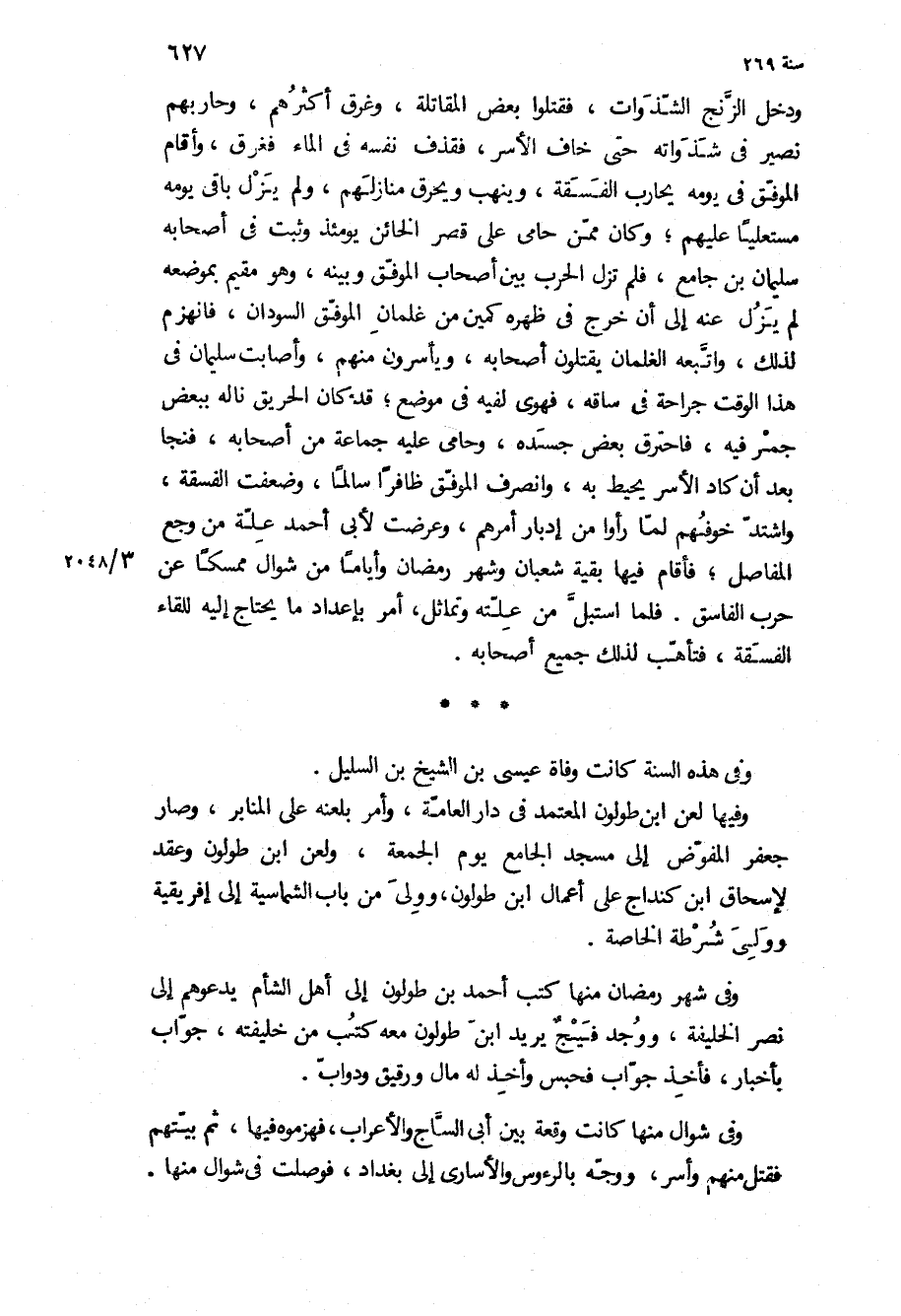 ودخل الزنج الشذوات، فقتلوا بعض المقاتلة، وغرق أكثرهم، وحاربهم نصير في شذواته حتى خاف الاسر، فقذف نفسه في الماء فغرق، وأقام الموفق في يومه يحارب الفسقة، وينهب ويحرق منازلهم، ولم يزل باقي يومه مستعليا عليهم، وكان ممن حامى على قصر الخائن يومئذ وثبت في أصحابه سليمان بن جامع، فلم تزل الحرب بين أصحاب الموفق وبينه، وهو مقيم بموضعه لم يزل عنه إلى أن خرج في ظهره كمين من غلمان الموفق السودان، فانهزم لذلك، واتبعه الغلمان يقتلون أصحابه، ويأسرون منهم، وأصابت سليمان في هذا الوقت جراحة في ساقه، فهوى لفيه في موضع، قد كان الحريق ناله ببعض جمر فيه، فاحترق بعض جسده، وحامى عليه جماعة من أصحابه، فنجا بعد أن كاد الأسر يحيط به، وانصرف الموفق ظافرا سالما، وضعفت الفسقة، واشتد خوفهم لما رأوا من إدبار أمرهم، وعرضت لأبي أحمد علة من وجع المفاصل، فأقام فيها بقية شعبان وشهر رمضان وأياما من شوال ممسكا عن حرب الفاسق فلما استبل من علته وتماثل، أمر بإعداد ما يحتاج إليه للقاء الفسقه، فتأهب لذلك جميع اصحابه.