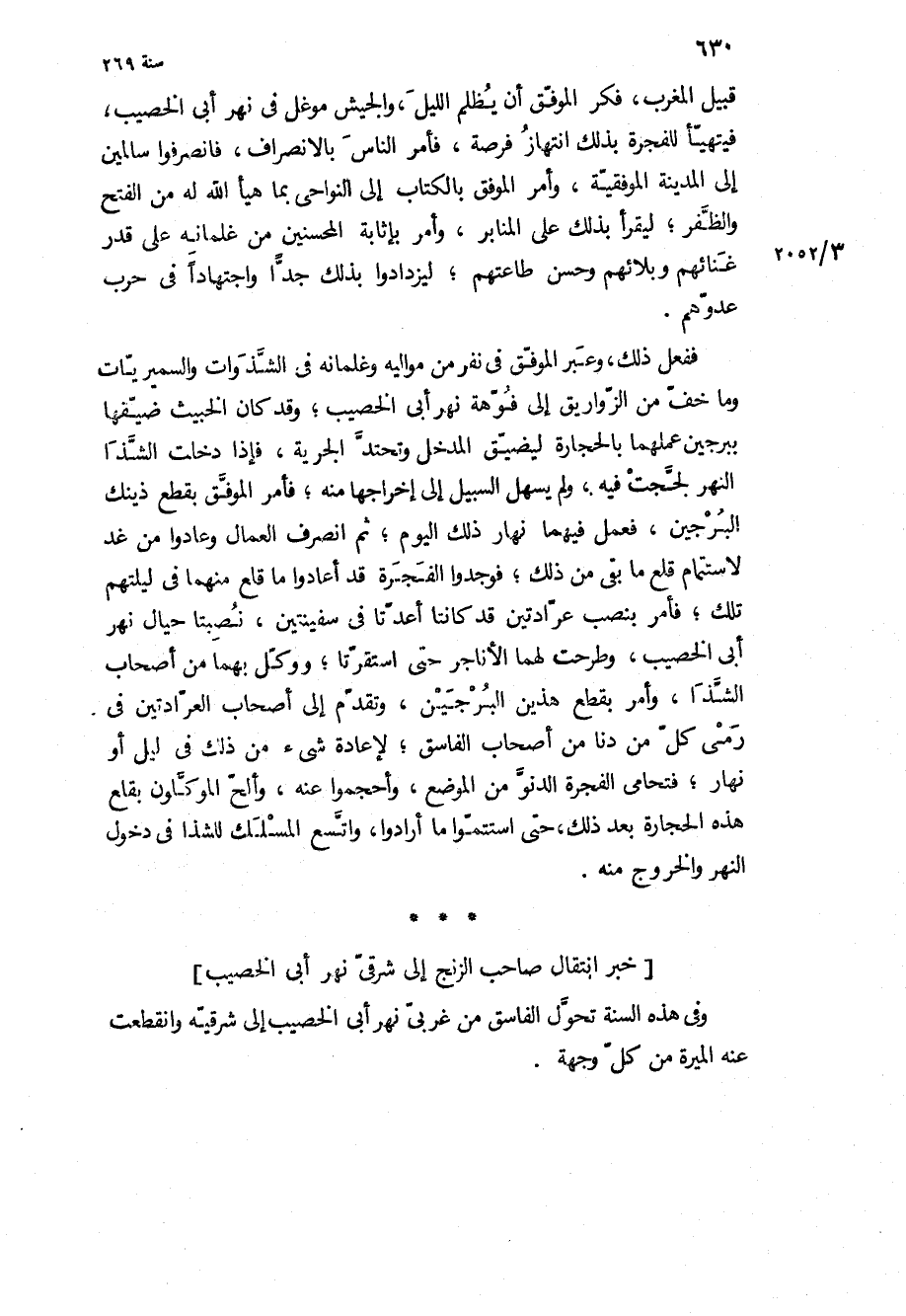ففعل ذلك، وعبر الموفق في نفر من مواليه وغلمانه في الشذوات والسميريات وما خف من الزواريق إلى فوهة نهر أبي الخصيب، وقد كان الخبيث ضيقها ببرجين عملهما بالحجارة ليضيق المدخل وتحتد الجرية، فإذا دخلت الشذا النهر لججت فيه، ولم يسهل السبيل إلى إخراجها منه، فأمر الموفق بقطع ذينك البرجين، فعمل فيهما نهار ذلك اليوم، ثم انصرف العمال وعادوا من غد لاستتمام قلع ما بقي من ذلك، فوجدوا الفجرة قد أعادوا ما قلع منهما في ليلتهم تلك، فأمر بنصب عرادتين قد كانتا أعدتا في سفينتين، نصبتا حيال نهر أبي الخصيب، وطرحت لهما الأناجر حتى استقرتا، ووكل بهما من أصحاب الشذا، وأمر بقطع هذين البرجين، وتقدم إلى أصحاب العرادتين في رمي كل من دنا من أصحاب الفاسق، لإعادة شيء من ذلك في ليل أو نهار، فتحامى الفجرة الدنو من الموضع، وأحجموا عنه، وألح الموكلون بقلع هذه الحجارة بعد ذلك، حتى استتموا ما أرادوا، واتسع المسلك للشذا في دخول النهر والخروج منه.