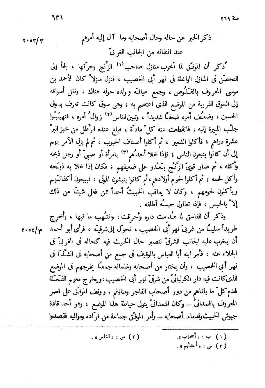 وذكر أن الفاسق لما هدمت داره وأحرقت، وانتهب ما فيها، وأخرج طريدا سليبا من غربي نهر أبي الخصيب، تحول إلى شرقيه، فرأى أبو أحمد أن يخرب عليه الجانب الشرقي لتصير حال الخبيث فيه كحاله في الغربي في الجلاء عنه، فأمر ابنه أبا العباس بالوقوف في جمع من أصحابه في الشذا في نهر أبي الخصيب، وأن يختار من أصحابه وغلمانه جمعا يخرجهم في الموضع الذي كانت فيه دار الكرنبائي من شرقي نهر أبي الخصيب، ويخرج معهم الفعلة لهدم كل ما يلقاهم من دور أصحاب الفاجر ومنازلهم، ووقف الموفق على قصر المعروف بالهمداني- وكان الهمداني يتولى حياطة هذا الموضع، وهو أحد قادة جيوش الخبيث وقدماء أصحابه- وأمر الموفق جماعة من قواده ومواليه فقصدوا
