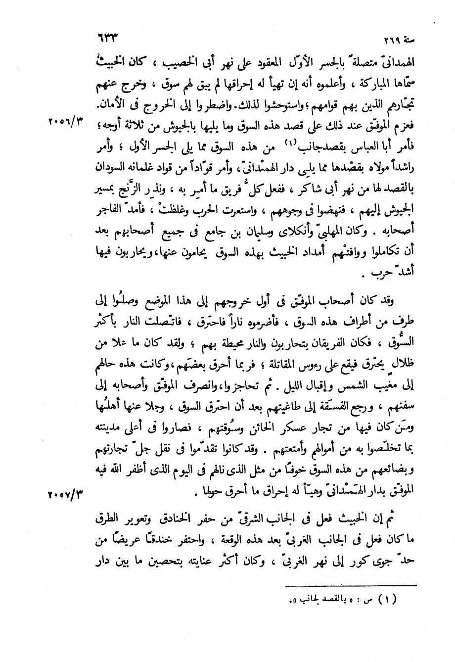الهمداني متصلة بالجسر الأول المعقود على نهر أبي الخصيب، كان الخبيث سماها المباركة، وأعلموه أنه إن تهيأ له إحراقها لم يبق لهم سوق، وخرج عنهم تجارهم الذين بهم قوامهم، واستوحشوا لذلك واضطروا إلى الخروج في الأمان.