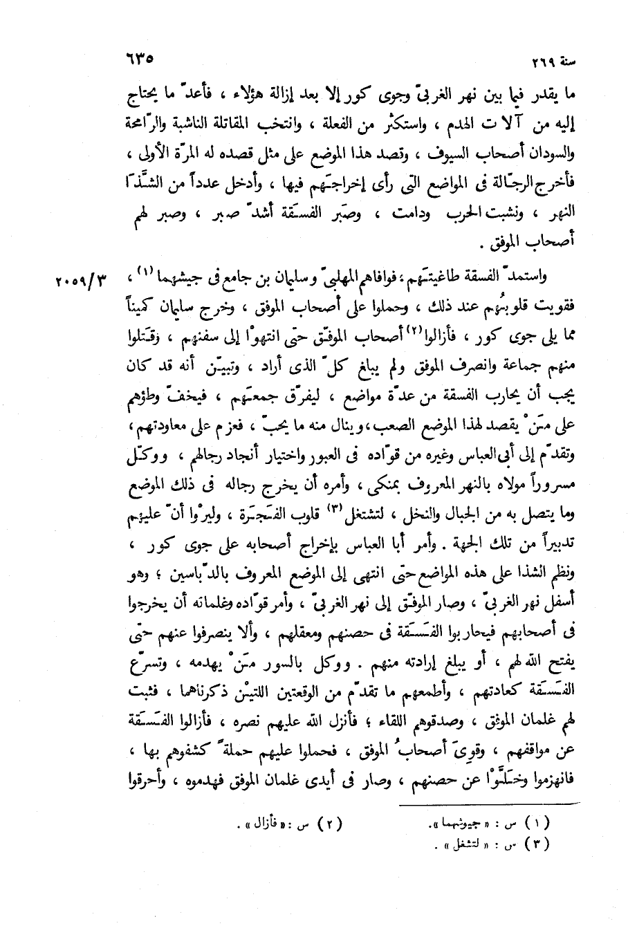 ما يقدر فيما بين نهر الغربي وجوى كور إلا بعد إزالة هؤلاء، فأعد ما يحتاج إليه من آلات الهدم، واستكثر من الفعلة، وانتخب المقاتلة الناشبة والرامحة والسودان أصحاب السيوف، وقصد هذا الموضع على مثل قصده له المرة الأولى، فأخرج الرجالة في المواضع التي رأى إخراجهم فيها، وأدخل عددا من الشذا النهر، ونشبت الحرب ودامت، وصبر الفسقة أشد صبر، وصبر لهم أصحاب الموفق.