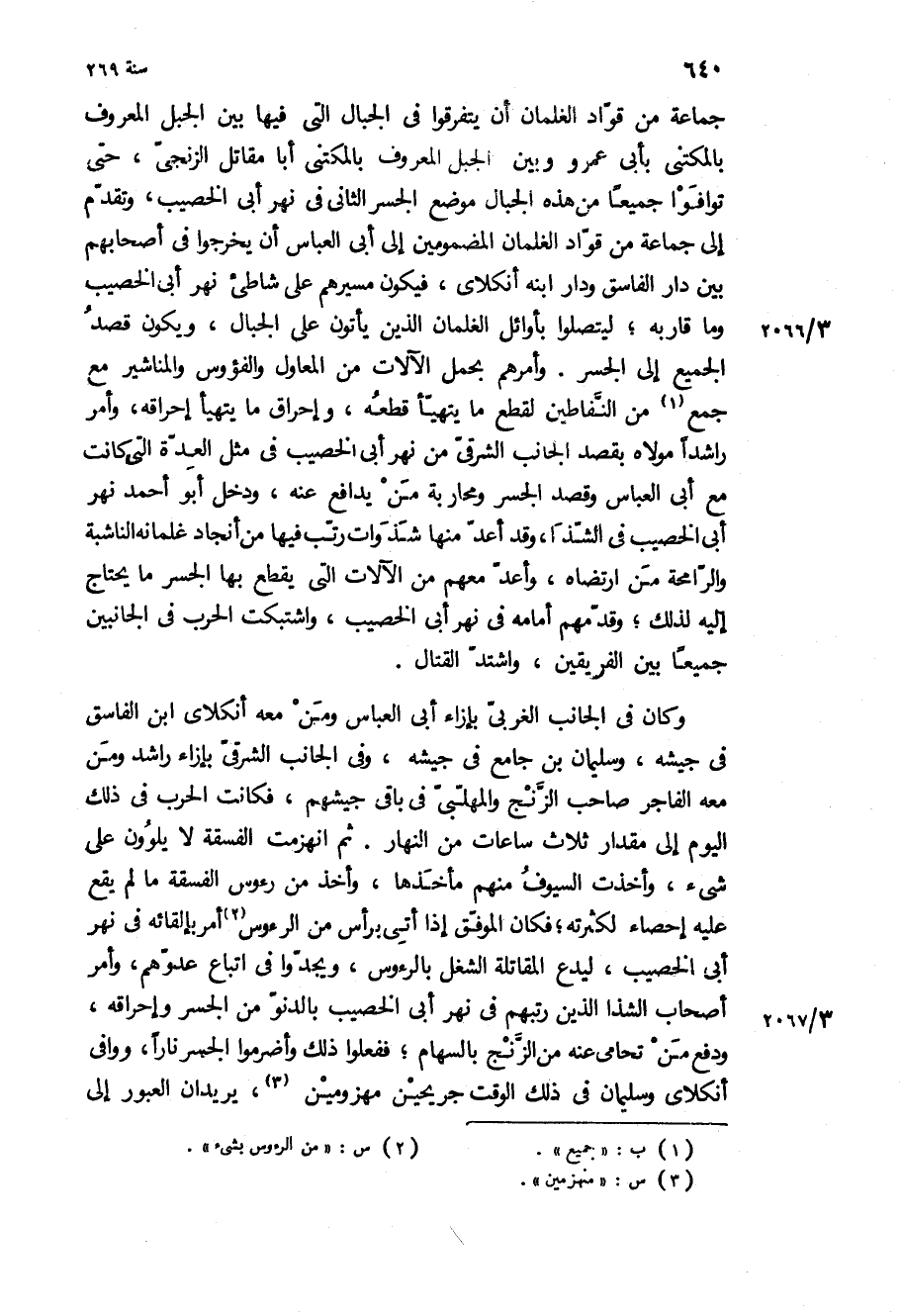 جماعة من قواد الغلمان أن يتفرقوا في الجبال التي فيها بين الجبل المعروف بالمكتنى بأبي عمرو وبين الجبل المعروف بالمكتنى أبا مقاتل الزنجي، حتى توافوا جميعا من هذه الجبال موضع الجسر الثاني في نهر أبي الخصيب، وتقدم إلى جماعة من قواد الغلمان المضمومين إلى أبي العباس أن يخرجوا في أصحابهم بين دار الفاسق ودار ابنه أنكلاي، فيكون مسيرهم على شاطئ نهر أبي الخصيب وما قاربه، ليتصلوا بأوائل الغلمان الذين يأتون على الجبال، ويكون قصد الجميع إلى الجسر وامرهم بحمل الآلات من المعاول والفؤوس والمناشير مع جمع من النفاطين لقطع ما يتهيأ قطعه، وإحراق ما يتهيأ إحراقه، وأمر راشدا مولاه بقصد الجانب الشرقي من نهر أبي الخصيب في مثل العدة التي كانت مع أبي العباس وقصد الجسر ومحاربة من يدافع عنه، ودخل أبو أحمد نهر أبي الخصيب في الشذا، وقد أعد منها شذوات رتب فيها من أنجاد غلمانه الناشبة والرامحة من ارتضاه، وأعد معهم من الآلات التي يقطع بها الجسر ما يحتاج إليه لذلك، وقدمهم أمامه في نهر أبي الخصيب، واشتبكت الحرب في الجانبين جميعا بين الفريقين، واشتد القتال وكان في الجانب الغربي بإزاء أبي العباس ومن معه أنكلاي ابن الفاسق في جيشه، وسليمان بن جامع في جيشه، وفي الجانب الشرقي بإزاء راشد ومن معه الفاجر صاحب الزنج والمهلبي في باقي جيشهم، فكانت الحرب في ذلك اليوم إلى مقدار ثلاث ساعات من النهار ثم انهزمت الفسقة لا يلوون على شيء، وأخذت السيوف منهم مأخذها، وأخذ من رءوس الفسقة ما لم يقع عليه إحصاء لكثرته، فكان الموفق إذا أتي برأس من الرءوس أمر بإلقائه في نهر أبي الخصيب، ليدع المقاتلة الشغل بالرءوس، ويجدوا في اتباع عدوهم، وأمر أصحاب الشذا الذين رتبهم في نهر أبي الخصيب بالدنو من الجسر وإحراقه، ودفع من تحامى عنه من الزنج بالسهام، ففعلوا ذلك وأضرموا الجسر نارا، ووافى أنكلاي وسليمان في ذلك الوقت جريحين مهزومين، يريدان العبور إلى