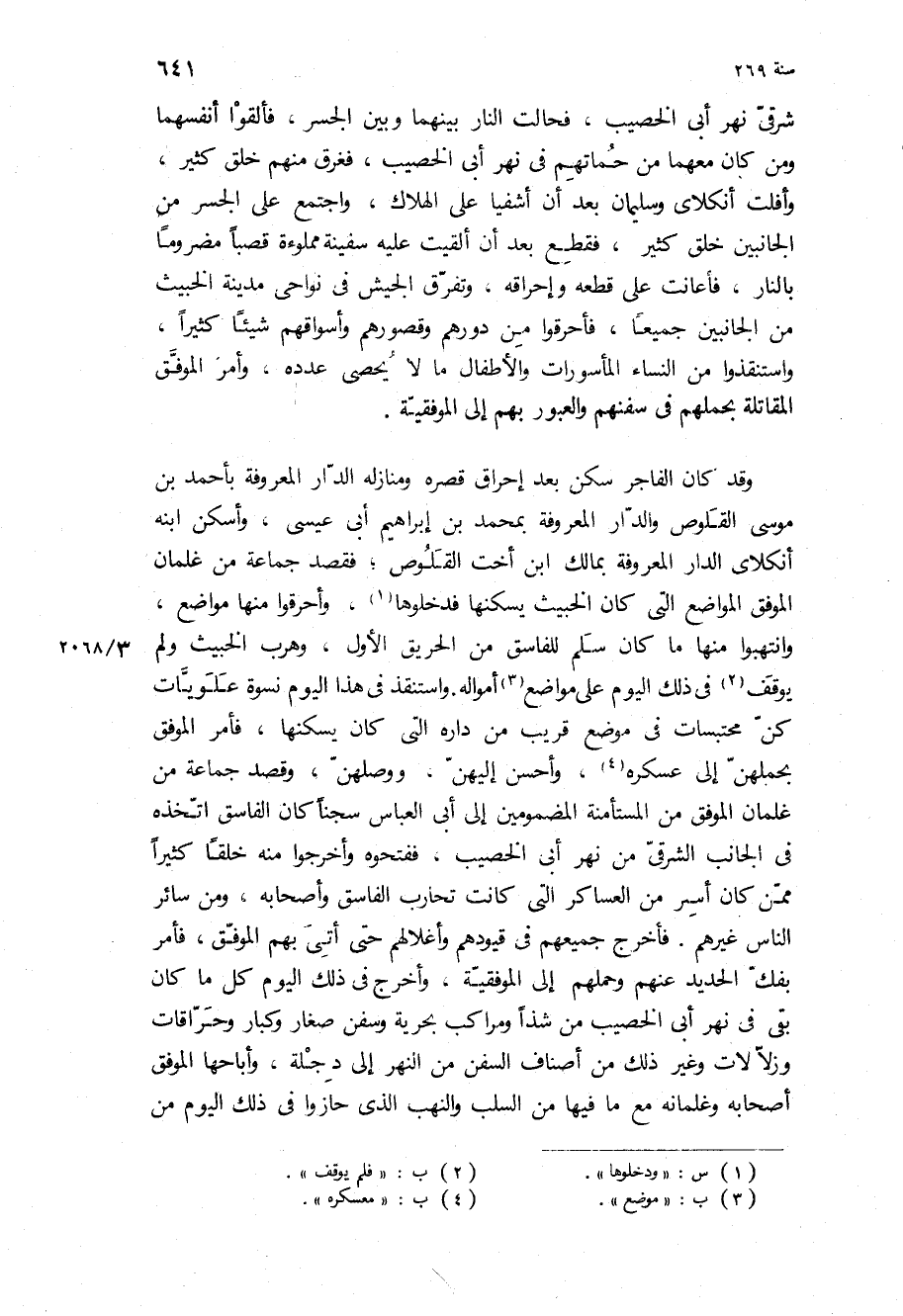 شرقي نهر أبي الخصيب، فحالت النار بينهما وبين الجسر، فألقوا أنفسهما ومن كان معهما من حماتهم في نهر أبي الخصيب، فغرق منهم خلق كثير، وأفلت أنكلاي وسليمان بعد أن أشفيا على الهلاك، وأجتمع على الجسر من الجانبين خلق كثير، فقطع بعد أن ألقيت عليه سفينة مملوءة قصبا مضروما بالنار، فأعانت على قطعه وإحراقه، وتفرق الجيش في نواحي مدينة الخبيث من الجانبين جميعا، فأحرقوا من دورهم وقصورهم وأسواقهم شيئا كثيرا، واستنقذوا من النساء المأسورات والأطفال ما لا يحصى عدده، وأمر الموفق المقاتلة بحملهم في سفنهم والعبور بهم إلى الموفقية.