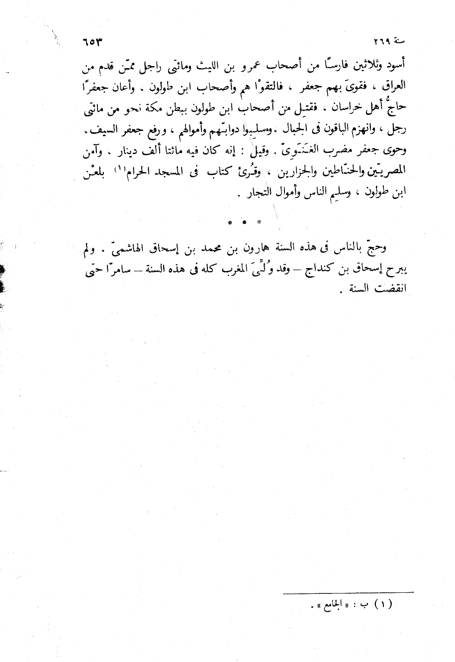 أسود وثلاثين فارسا من أصحاب عمرو بن الليث ومائتي راجل ممن قدم من العراق، فقوي بهم جعفر، فالتقوا هم وأصحاب ابن طولون، وأعان جعفرا حاج أهل خراسان، فقتل من أصحاب ابن طولون ببطن مكة نحو من مائتي رجل، وانهزم الباقون في الجبال وسلبوا دوابهم وأموالهم، ورفع جعفر السيف.