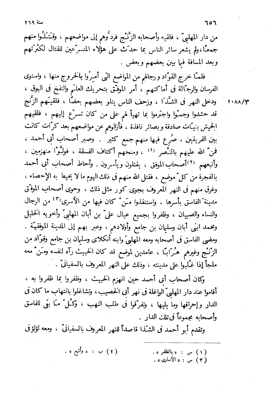 من دار المهلبي، فلقيه وأصحابه الزنج فردوهم إلى مواضعهم، وقتلوا منهم جمعا، ولم يشعر سائر الناس بما حدث على هؤلاء المتسرعين للقتال لكثرتهم وبعد المسافة فيما بين بعضهم وبعض.