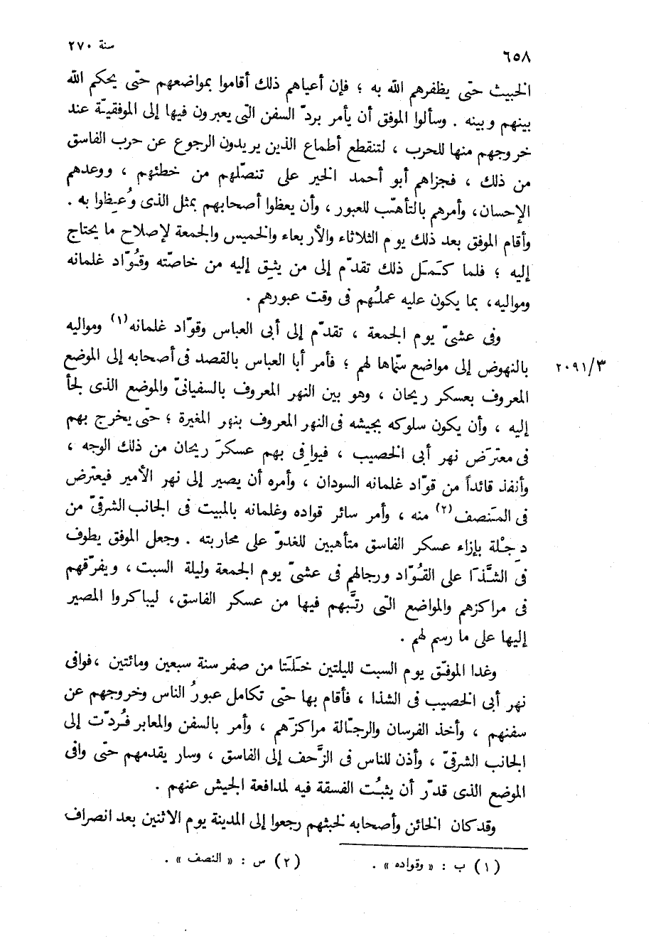 الخبيث حتى يظفرهم الله به، فإن أعياهم ذلك أقاموا بمواضعهم حتى يحكم الله بينهم وبينه وسألوا الموفق أن يأمر برد السفن التي يعبرون فيها الى الموفقيه عند خروجهم منها للحرب، لتنقطع أطماع الذين يريدون الرجوع عن حرب الفاسق من ذلك، فجزاهم أبو أحمد الخير على تنصلهم من خطئهم، ووعدهم الإحسان، وأمرهم بالتأهب للعبور، وأن يعظوا أصحابهم بمثل الذي وعظوا به وأقام الموفق بعد ذلك يوم الثلاثاء والأربعاء والخميس والجمعة لإصلاح ما يحتاج إليه، فلما كمل ذلك تقدم إلى من يثق إليه من خاصته وقواد غلمانه ومواليه، بما يكون عليه عملهم في وقت عبورهم.