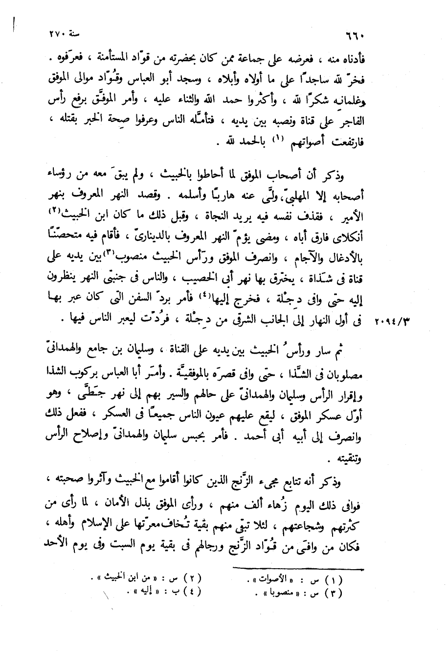 فخر لله ساجدا على ما أولاه وأبلاه، وسجد أبو العباس وقواد موالي الموفق وغلمانه شكرا لله، وأكثروا حمد الله والثناء عليه، وأمر الموفق برفع رأس الفاجر على قناة ونصبه بين يديه، فتأمله الناس وعرفوا صحة الخبر بقتله، فارتفعت أصواتهم بالحمد لله وذكر أن أصحاب الموفق لما أحاطوا بالخبيث، ولم يبق معه من رؤساء أصحابه إلا المهلبي، ولى عنه هاربا واسلمه وقصد النهر المعروف بنهر الأمير، فقذف نفسه فيه يريد النجاة، وقبل ذلك ما كان ابن الخبيث أنكلاي فارق أباه، ومضى يؤم النهر المعروف بالديناري، فأقام فيه متحصنا بالأدغال والآجام، وانصرف الموفق ورأس الخبيث منصوب بين يديه على قناة في شذاة، يخترق بها نهر أبي الخصيب، والناس في جنبتي النهر ينظرون إليه حتى وافى دجلة، فخرج إليها فأمر برد السفن التي كان عبر بها في أول النهار إلى الجانب الشرقي من دجلة، فردت ليعبر الناس فيها.