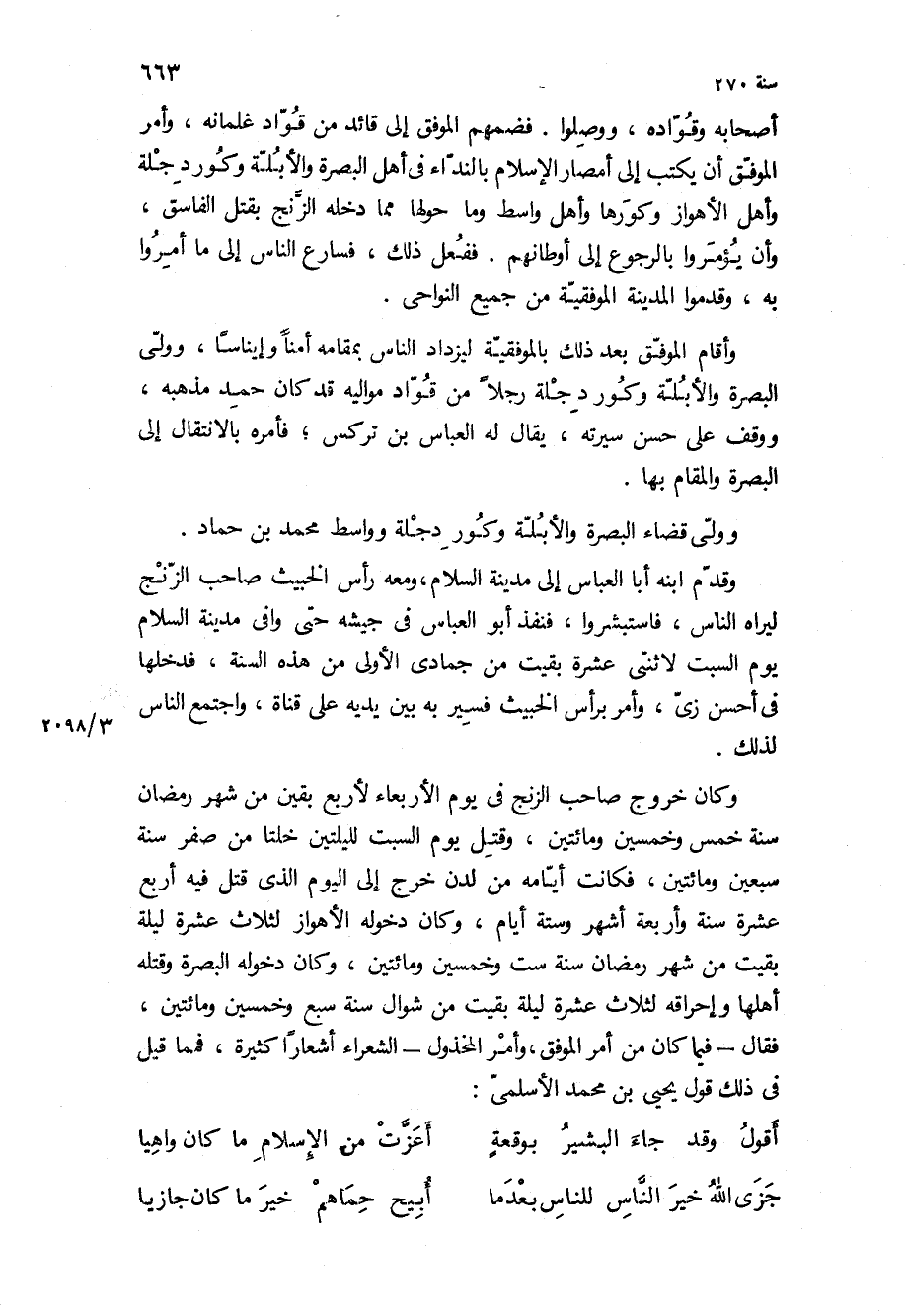 وكان خروج صاحب الزنج في يوم الأربعاء لأربع بقين من شهر رمضان سنة خمس وخمسين ومائتين، وقتل يوم السبت لليلتين خلتا من صفر سنة سبعين ومائتين، فكانت أيامه من لدن خرج إلى اليوم الذي قتل فيه أربع عشرة سنة وأربعة أشهر وستة أيام، وكان دخوله الأهواز لثلاث عشرة ليلة بقيت من شهر رمضان سنة ست وخمسين ومائتين، وكان دخوله البصرة وقتله أهلها وإحراقه لثلاث عشرة ليلة بقيت من شوال سنة سبع وخمسين ومائتين، فقال- فيما كان من أمر الموفق، وأمر المخذول- الشعراء أشعارا كثيرة، فمما قيل في ذلك قول يحيى بن محمد الأسلمي: