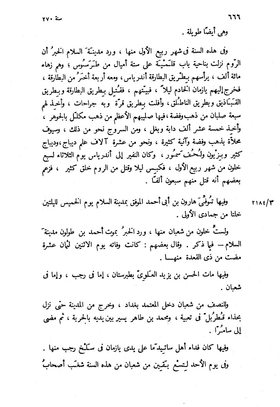 وفي هذه السنة في شهر ربيع الأول منها، ورد مدينة السلام الخبر أن الروم نزلت بناحية باب قلمية على ستة أميال من طرسوس، وهم زهاء مائة ألف، يرأسهم بطريق البطارقة أندرياس، ومعه أربعة أخر من البطارقة، فخرج إليهم يازمان الخادم ليلا، فبيتهم، فقتل بطريق البطارقة وبطريق القباذيق وبطريق الناطلق، وأفلت بطريق قرة وبه جراحات، وأخذ لهم سبعة صلبان من ذهب وفضة، فيها صليبهم الأعظم من ذهب مكلل بالجوهر، وأخذ خمسة عشر ألف دابة وبغل، ومن السروج نحو من ذلك، وسيوف محلاة بذهب وفضة وآنية كثيرة، ونحو من عشرة آلاف علم ديباج، وديباج كثير وبزيون ولحف سمور، وكان النفير إلى أندرياس يوم الثلاثاء لسبع خلون من شهر ربيع الأول، فكبس ليلا وقتل من الروم خلق كثير، فزعم بعضهم أنه قتل منهم سبعون ألفا وفيها توفي هارون بن أبي أحمد الموفق بمدينة السلام يوم الخميس لليلتين خلتا من جمادى الأولى.