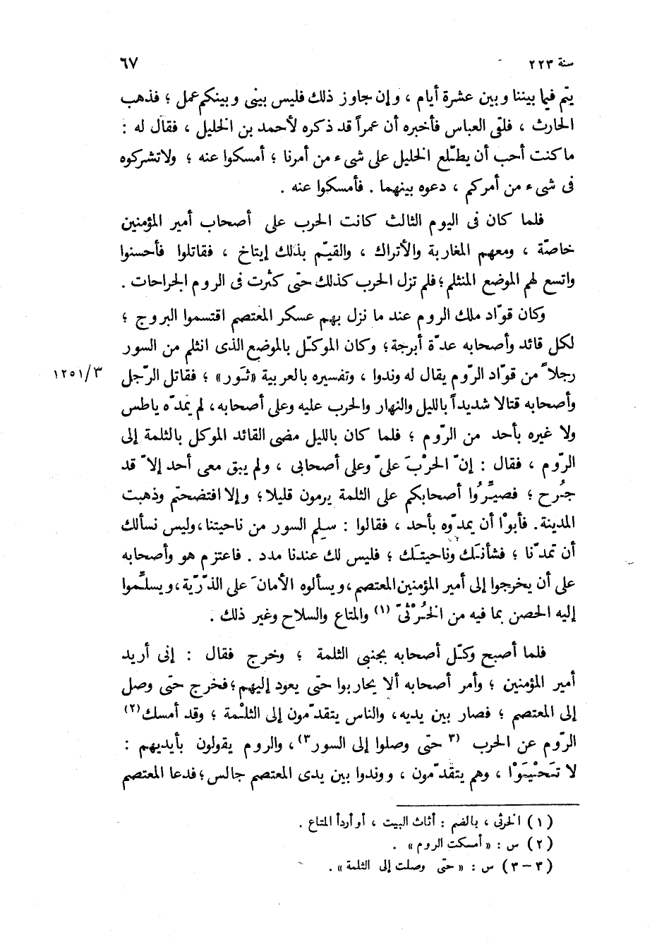ولا تشركوه في شيء من أمركم، دعوه بينهما فأمسكوا عنه فلما كان في اليوم الثالث كانت الحرب على أصحاب أمير المؤمنين خاصة، ومعهم المغاربة والأتراك، والقيم بذلك إيتاخ، فقاتلوا فأحسنوا واتسع لهم الموضع المنثلم، فلم تزل الحرب كذلك حتى كثرت في الروم الجراحات.