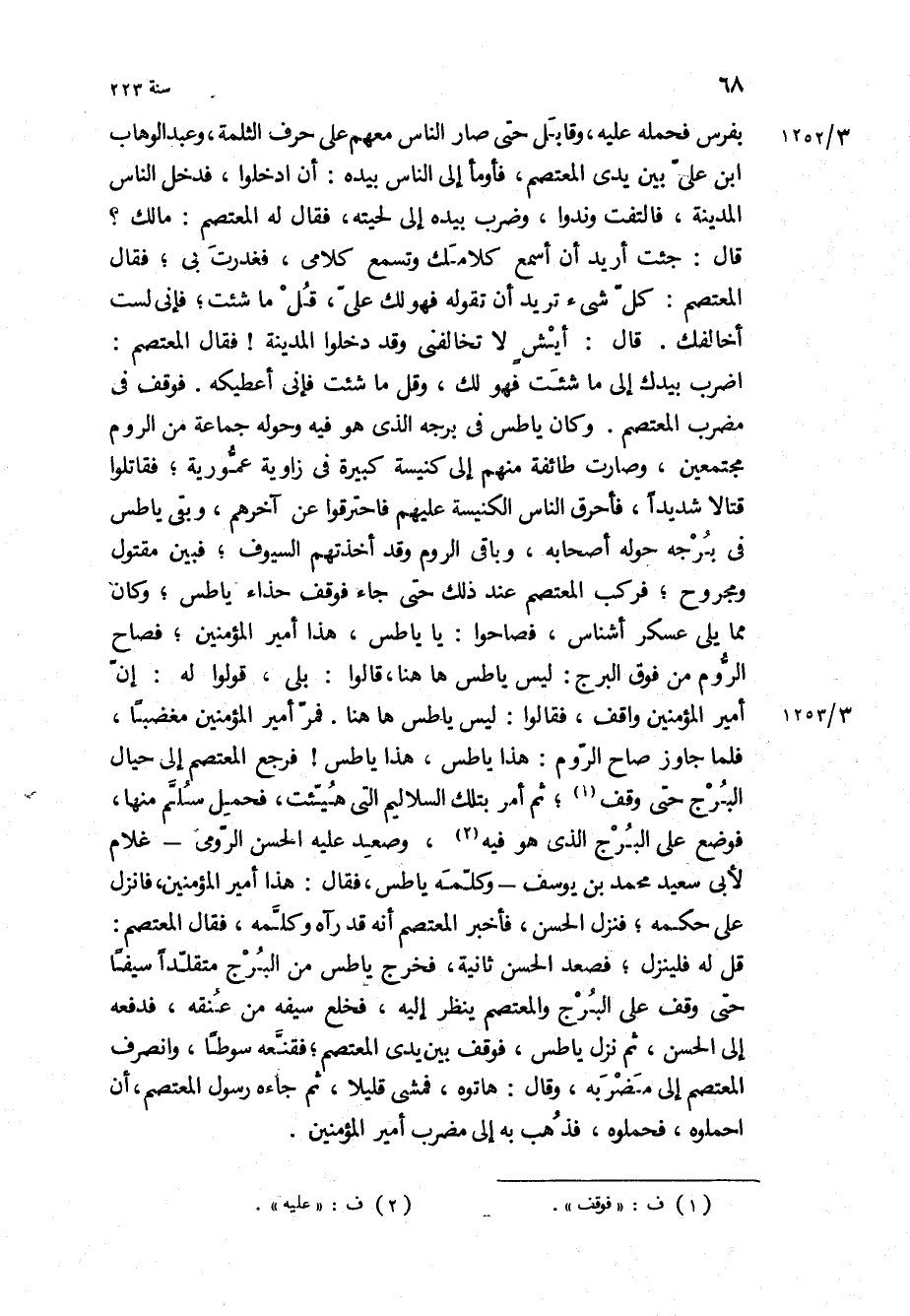 اضرب بيدك إلى ما شئت فهو لك، وقل ما شئت فإني أعطيكه فوقف في مضرب المعتصم وكان ياطس في برجه الذي هو فيه وحوله جماعة من الروم مجتمعين، وصارت طائفة منهم إلى كنيسة كبيرة في زاوية عمورية، فقاتلوا قتالا شديدا، فأحرق الناس الكنيسة عليهم فاحترقوا عن آخرهم، وبقي ياطس في برجه حوله أصحابه، وباقي الروم وقد أخذتهم السيوف، فبين مقتول ومجروح، فركب المعتصم عند ذلك حتى جاء فوقف حذاء ياطس، وكان مما يلي عسكر أشناس، فصاحوا: يا ياطس، هذا أمير المؤمنين، فصاح الروم من فوق البرج: ليس ياطس هاهنا، قالوا: بلى، قولوا له: إن أمير المؤمنين واقف، فقالوا: ليس ياطس هاهنا فمر أمير المؤمنين مغضبا، فلما جاوز صاح الروم: هذا ياطس، هذا ياطس! فرجع المعتصم إلى حيال البرج حتى وقف، ثم أمر بتلك السلاليم التي هيئت، فحمل سلم منها، فوضع على البرج الذي هو فيه، وصعد عليه الحسن الرومي- غلام لأبي سعيد محمد بن يوسف- وكلمه ياطس، فقال: هذا أمير المؤمنين، فانزل على حكمه، فنزل الحسن، فأخبر المعتصم أنه قد رآه وكلمه، فقال المعتصم: