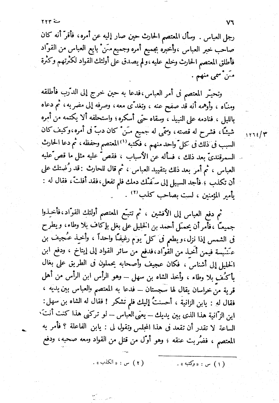 رجل العباس وسأل المعتصم الحارث حين صار إليه عن أمره، فأقر أنه كان صاحب خبر العباس، وأخبره بجميع أمره وجميع من بايع العباس من القواد فأطلق المعتصم الحارث وخلع عليه، ولم يصدق على أولئك القواد لكثرتهم وكثرة من سمي منهم.