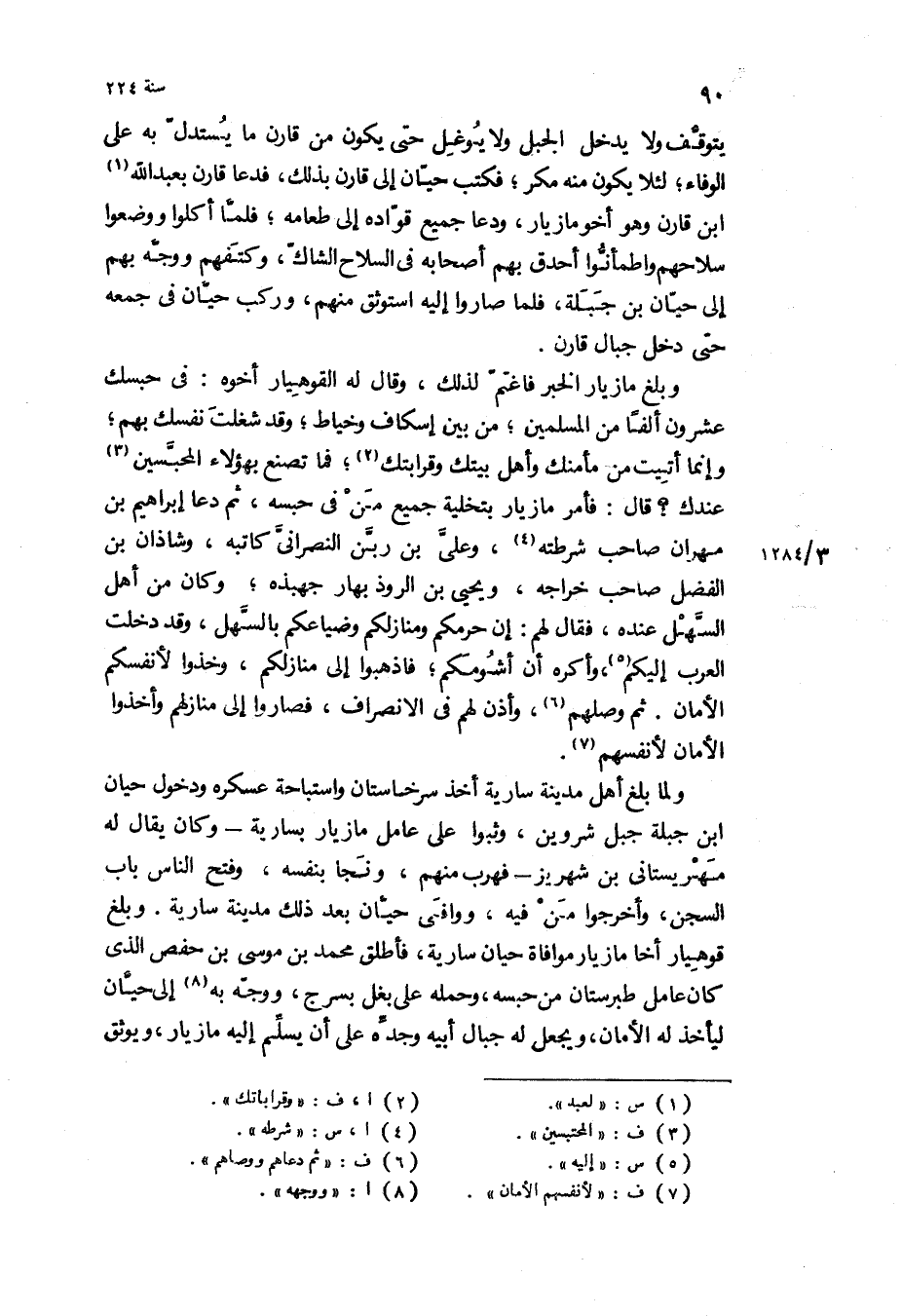 يتوقف ولا يدخل الجبل ولا يوغل حتى يكون من قارن ما يستدل به على الوفاء، لئلا يكون منه مكر، فكتب حيان إلى قارن بذلك، فدعا قارن بعبد الله ابن قارن وهو أخو مازيار، ودعا جميع قواده إلى طعامه، فلما أكلوا ووضعوا سلاحهم واطمأنوا أحدق بهم أصحابه في السلاح الشاك، وكتفهم ووجه بهم إلى حيان بن جبلة، فلما صاروا إليه استوثق منهم، وركب حيان في جمعه حتى دخل جبال قارن.