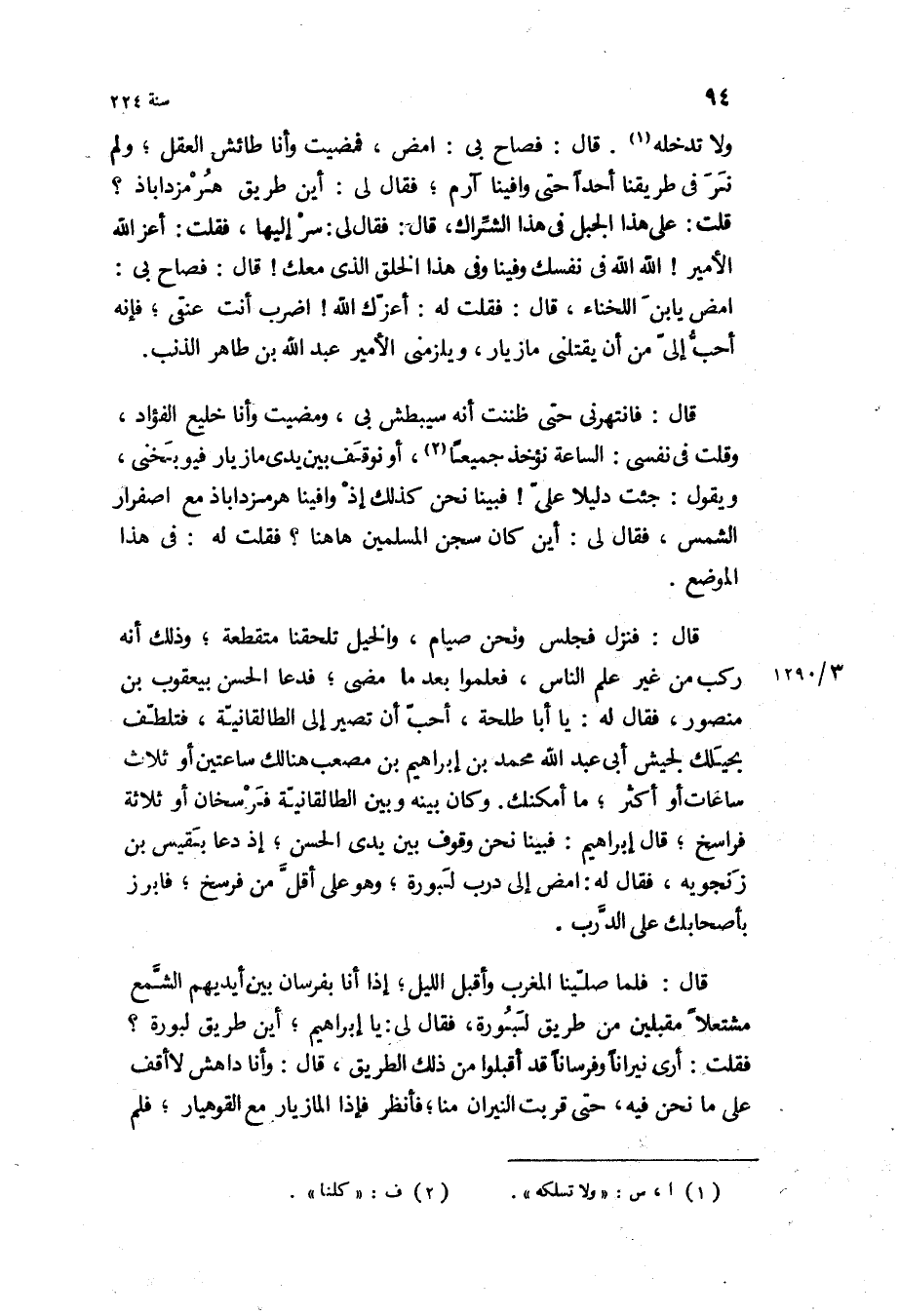 قال: فانتهرني حتى ظننت أنه سيبطش بي، ومضيت وأنا خليع الفؤاد، وقلت في نفسي: الساعة نؤخذ جميعا، او نوقف بين يدي مازيار فيوبخني، ويقول: جئت دليلا علي! فبينا نحن كذلك إذ وافينا هرمزداباذ مع اصفرار الشمس، فقال لي: أين كان سجن المسلمين هاهنا؟ فقلت له: في هذا الموضع.
