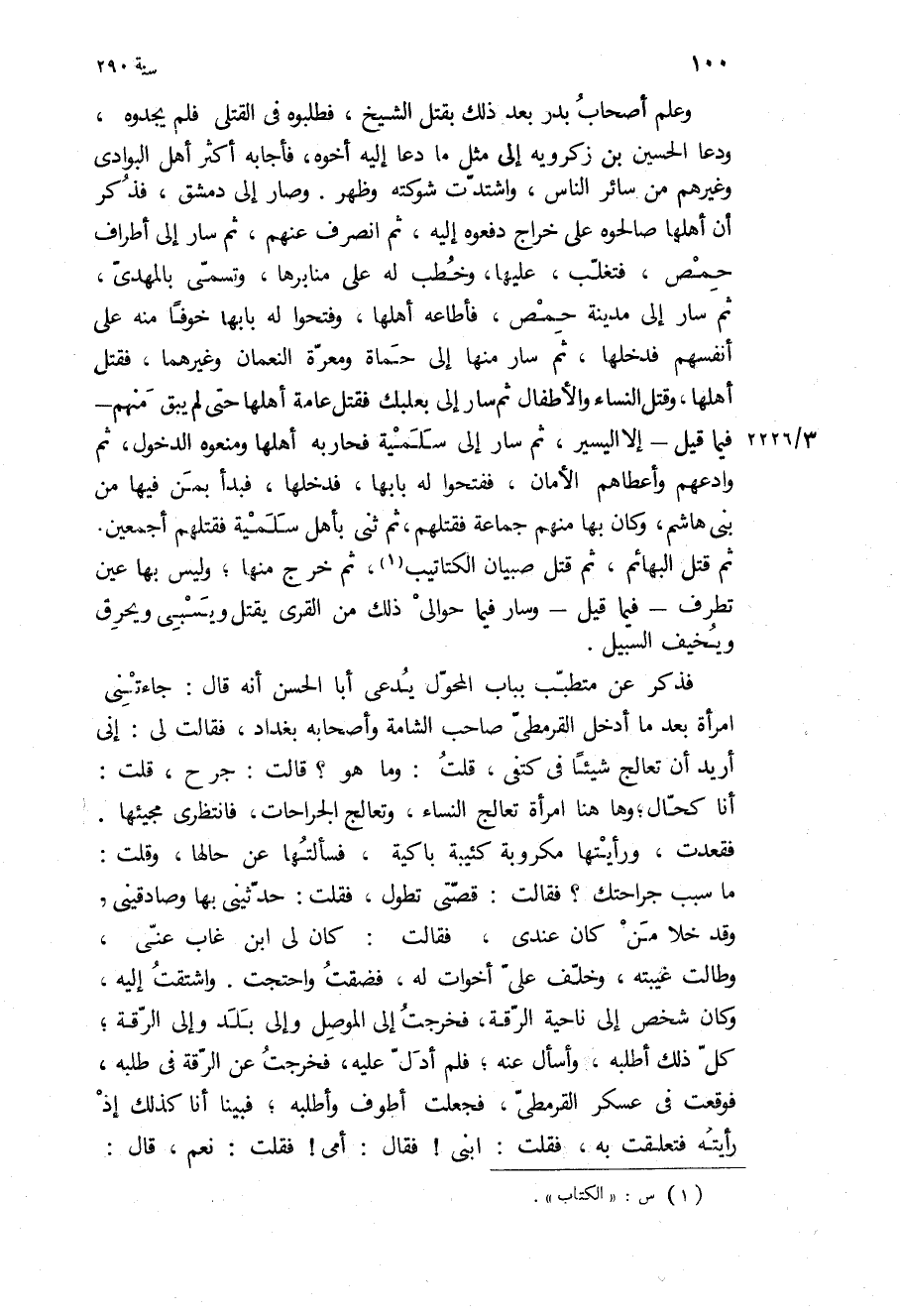 ما سبب جراحتك؟ فقالت: قصتي تطول، فقلت: حدثيني بها وصادقينى، وقد خلا من كان عندي، فقالت: كان لي ابن غاب عنى، وطالت غيبته، وخلف على اخوات له، فضقت واحتجت واشتقت اليه، وكان شخص الى ناحيه الرقة، فخرجت الى الموصل والى بلد والى الرقة، كل ذلك اطلبه، واسال عنه، فلم ادل عليه، فخرجت عن الرقة في طلبه، فوقعت في عسكر القرمطى، فجعلت اطوف واطلبه، فبينا انا كذلك إذ رايته فتعلقت به، فقلت: ابنى! فقال: أمي! فقلت: نعم، قال: