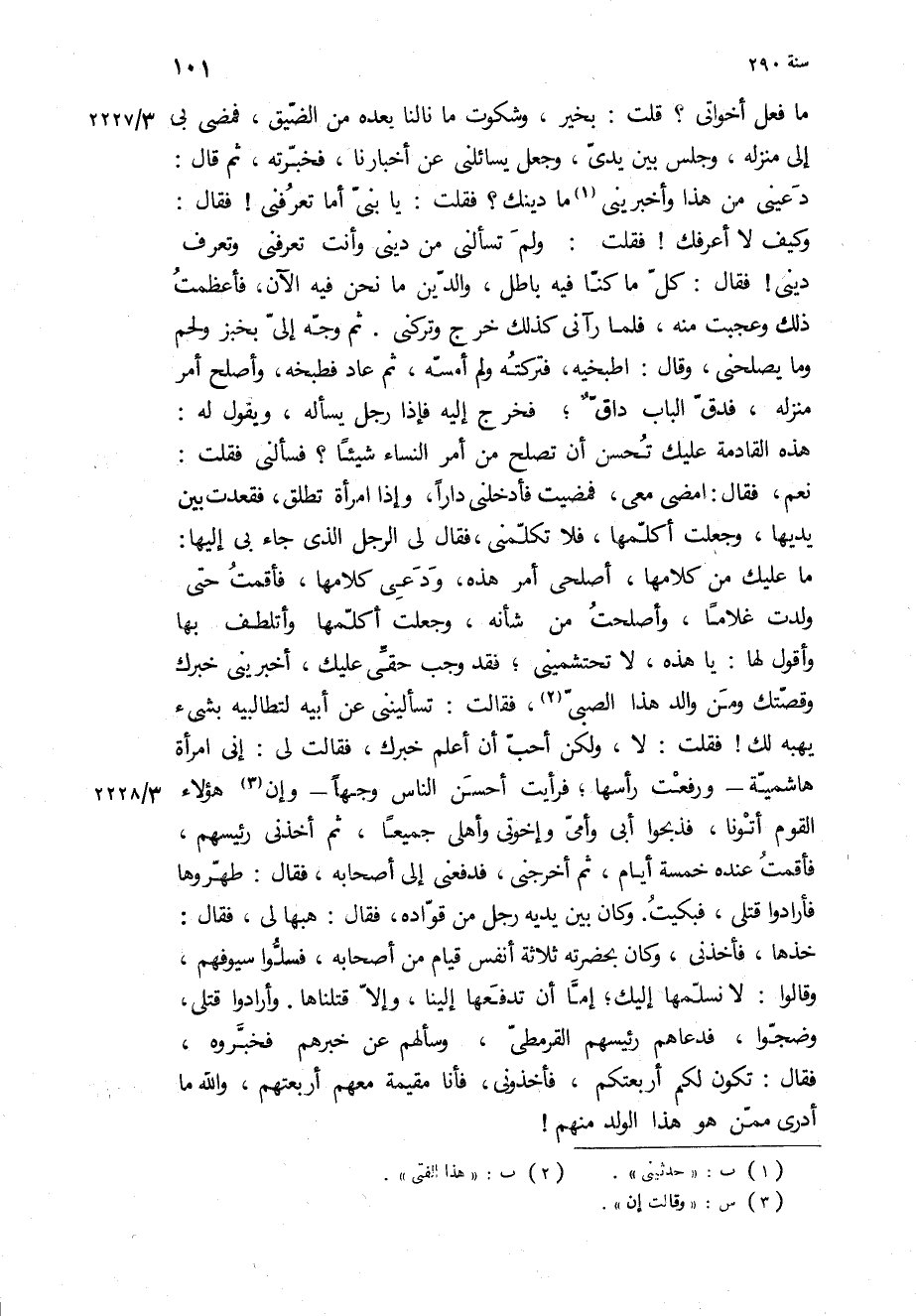 ما عليك من كلامها، اصلحى امر هذه، ودعى كلامها، فاقمت حتى ولدت غلاما، واصلحت من شانه، وجعلت اكلمها واتلطف بها واقول لها: يا هذه، لا تحتشمينى، فقد وجب حقي عليك، أخبريني خبرك وقصتك ومن والد هذا الصبى، فقالت: تساليننى عن ابيه لتطالبيه بشيء يهبه لك! فقلت: لا، ولكن أحب ان اعلم خبرك، فقالت لي: انى امراه هاشمية- ورفعت راسها، فرايت احسن الناس وجها- وان هؤلاء القوم أتونا، فذبحوا ابى وأمي واخوتى واهلى جميعا، ثم أخذني رئيسهم، فاقمت عنده خمسه ايام، ثم أخرجني، فدفعنى الى اصحابه، فقال: طهروها فأرادوا قتلى، فبكيت وكان بين يديه رجل من قواده، فقال: هبها لي، فقال: