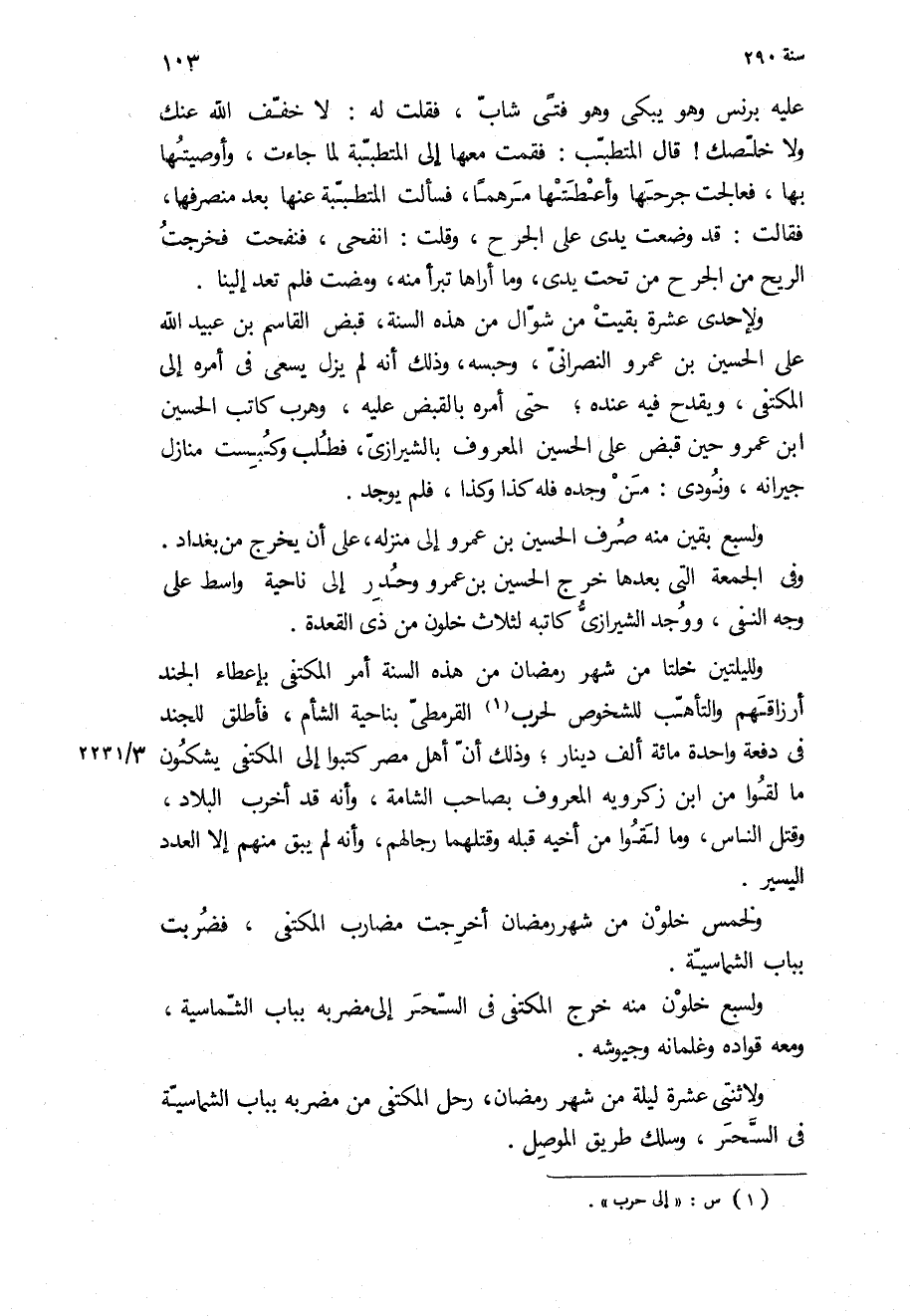 ولاثنتى عشره ليله من شهر رمضان، رحل المكتفي من مضربه بباب الشماسيه في السحر، وسلك طريق الموصل