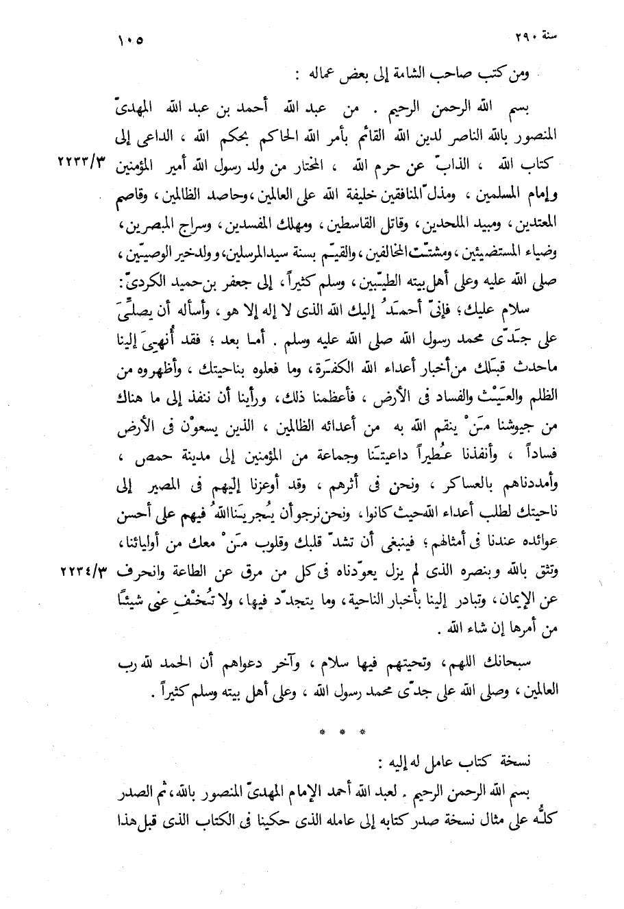 بِسْمِ اللَّهِ الرَّحْمَنِ الرَّحِيمِ لعبد اللَّه احمد الامام المهدى المنصور بالله، ثم الصدر كله على مثال نسخه صدر كتابه الى عامله الذى حكينا في الكتاب الذى قبل هذا