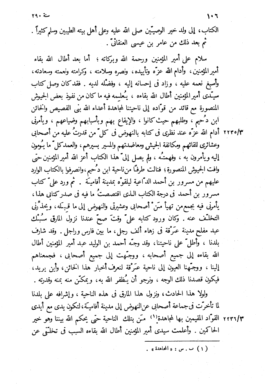 سلام على أَمِيرَ الْمُؤْمِنِينَ ورحمة اللَّه وبركاته، أَمَّا بَعْدُ اطال الله بقاء امير المؤمنين، وادام الله عزه وتاييده، ونصره وسلامته، وكرامته ونعمته وسعادته، واسبغ نعمه عليه، وزاد في إحسانه اليه، وفضله لديه فقد كان وصل كتاب سيدي امير المؤمنين اطال الله بقاءه، يعلمه فيه ما كان من نفوذ بعض الجيوش المنصوره مع قائد من قواده الى ناحيتنا لمجاهده أعداء الله بنى الفصيص والخائن ابن دحيم، وطلبهم حيث كانوا، والإيقاع بهم وباسبابهم وضياعهم، ويأمرني ادام الله عزه عند نظري في كتابه بالنهوض في كل من قدرت عليه من اصحابى وعشائرى للقائهم ومكانفه الجيش ومعاضدتهم والمسير بسيرهم، والعمد كل ما يومون اليه ويأمرون به، وفهمته، ولم يصل الى هذا الكتاب أعز الله امير المؤمنين حتى وافت الجيوش المنصوره، فنالت طرفا من ناحيه ابن دحيم، وانصرفوا بالكتاب الوارد عليهم من مسرور بن احمد الداعيه ليلقوه بمدينه افاميه ثم ورد على كتاب مسرور بن احمد في درجه الكتاب الذى اقتصصت ما فيه في صدر كتابي هذا، يأمرني فيه بجمع من تهيأ من اصحابى وعشيرتي والنهوض الى ما قبله، ويحذرني التخلف عنه وكان ورود كتابه على وقت صح عندنا نزول المارق سبك عبد مفلح مدينه عرقه في زهاء الف رجل، ما بين فارس وراجل وقد شارف بلدنا، واطل على ناحيتنا، وقد وجه احمد بن الوليد عبد امير المؤمنين اطال الله بقاءه الى جميع اصحابه، ووجهت الى جميع اصحابى، فجمعناهم إلينا، ووجهنا العيون الى ناحيه عرقه لنعرف اخبار هذا الخائن، واين يريد، فيكون قصدنا ذلك الوجه، ونرجو ان يظفر الله به، ويمكن منه بمنه وقدرته.