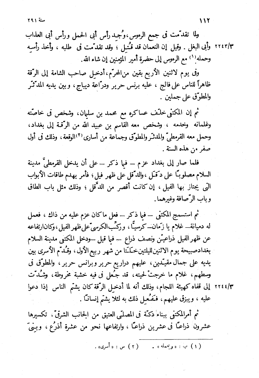 ثم ان المكتفي خلف عساكره مع محمد بن سليمان، وشخص في خاصته وغلمانه وخدمه، وشخص معه القاسم بن عبيد الله من الرقة الى بغداد، وحمل معه القرمطى والمدثر والمطوق وجماعه من أسارى الوقعه، وذلك في أول صفر من هذه السنه.