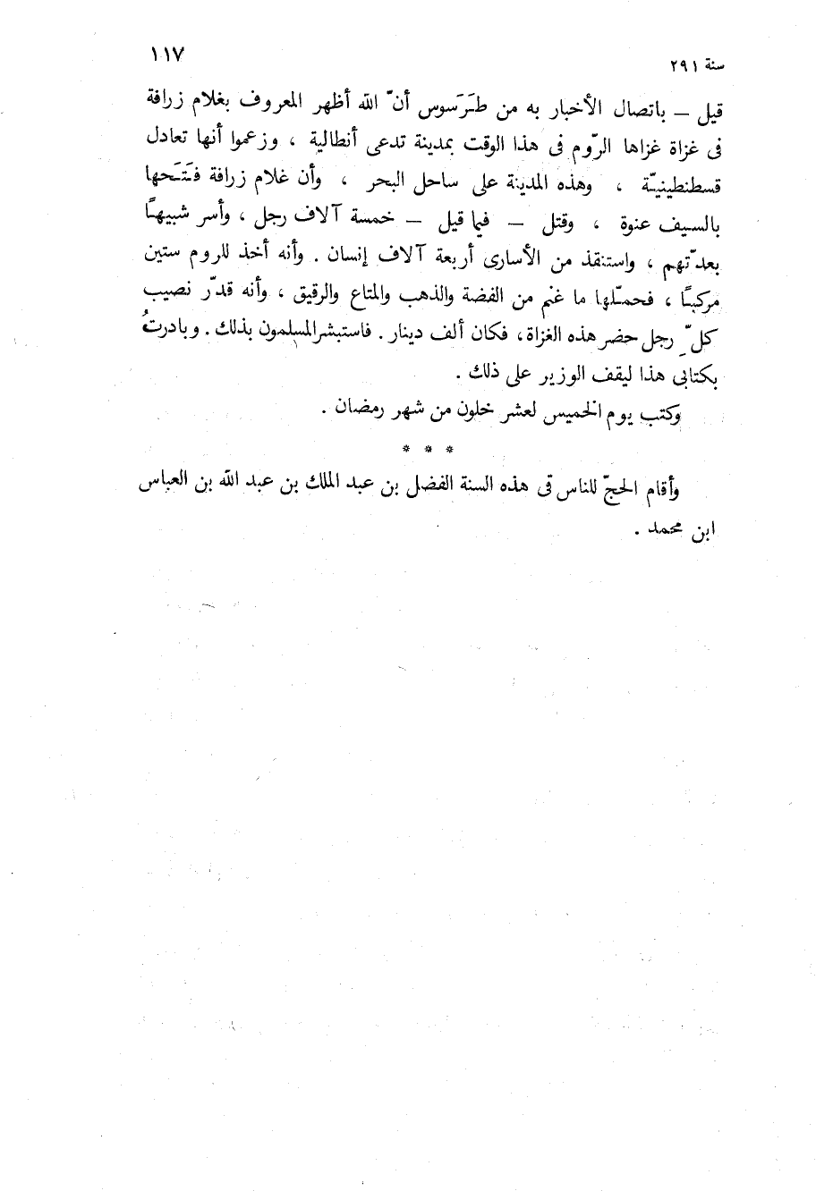 قيل- باتصال الاخبار به من طرسوس ان الله اظهر المعروف بغلام زرافه في غزاه غزاها الروم في هذا الوقت بمدينه تدعى انطاليه، وزعموا انها تعادل قسطنطينيه، وهذه المدينة على ساحل البحر، وان غلام زرافه فتحها بالسيف عنوه، وقتل- فيما قيل- خمسه آلاف رجل، واسر شبيها بعدتهم، واستنقذ من الأسارى اربعه آلاف انسان وانه أخذ للروم ستين مركبا، فحملها ما غنم من الفضه والذهب والمتاع والرقيق، وانه قدر نصيب كل رجل حضر هذه الغزاة، فكان الف دينار فاستبشر المسلمون بذلك وبادرت بكتابي هذا ليقف الوزير على ذلك.