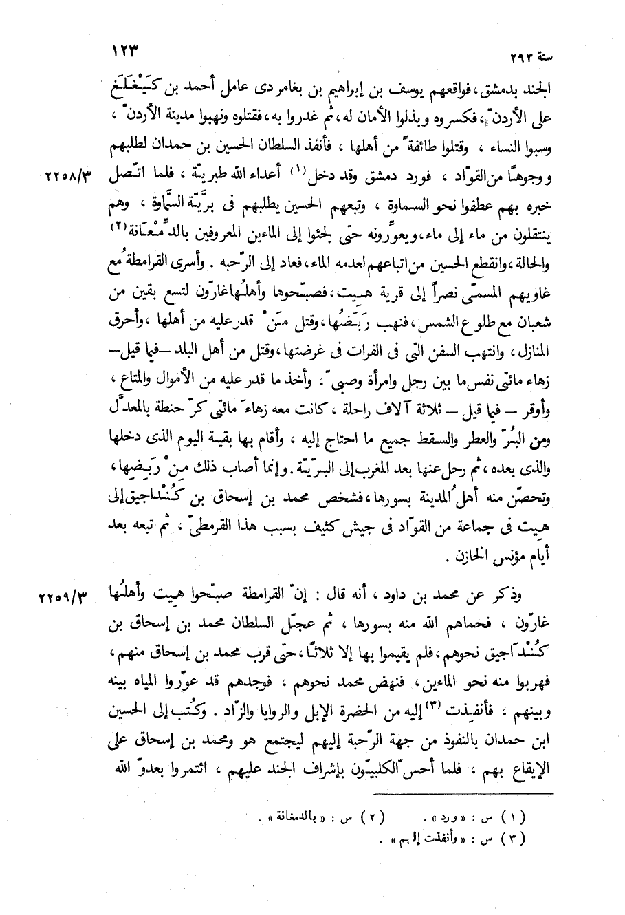 الجند بدمشق، فواقعهم يوسف بن ابراهيم بن بغامردى عامل احمد بن كيغلغ على الأردن، فكسروه وبذلوا الامان له، ثم غدروا به، فقتلوه ونهبوا مدينه الأردن، وسبوا النساء، وقتلوا طائفه من أهلها، فانفذ السلطان الحسين بن حمدان لطلبهم ووجوها من القواد، فورد دمشق وقد دخل أعداء الله طبرية، فلما اتصل خبره بهم عطفوا نحو السماوه، وتبعهم الحسين يطلبهم في بريه السماوه، وهم ينتقلون من ماء الى ماء، ويعورونه حتى لجئوا الى الماءين المعروفين بالدمعانه والحاله، وانقطع الحسين من اتباعهم لعدمه الماء، فعاد الى الرحبه واسرى القرامطة مع غاويهم المسمى نصرا الى قريه هيت، فصبحوها وأهلها غارون لتسع بقين من شعبان مع طلوع الشمس، فنهب ربضها، وقتل من قدر عليه من أهلها، واحرق المنازل، وانتهب السفن التي في الفرات في غرضتها، وقتل من اهل البلد- فيما قيل- زهاء مائتي نفس ما بين رجل وامراه وصبى، وأخذ ما قدر عليه من الأموال والمتاع، واوقر- فيما قيل- ثلاثة آلاف راحله، كانت معه زهاء مائتي كر حنطه بالمعدل ومن البر والعطر والسقط جميع ما احتاج اليه، واقام بها بقية اليوم الذى دخلها والذى بعده، ثم رحل عنها بعد المغرب الى البريه وانما أصاب ذلك من ربضها، وتحصن منه اهل المدينة بسورها، فشخص محمد بن إسحاق بن كنداجيق الى هيت في جماعه من القواد في جيش كثيف بسبب هذا القرمطى، ثم تبعه بعد ايام مؤنس الخازن.