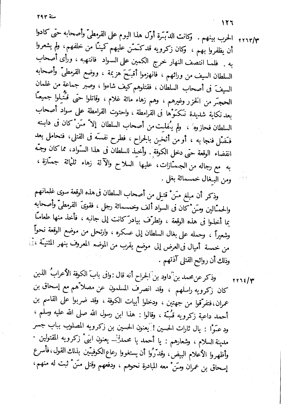 الحرب بينهم وكانت الدبره أول هذا اليوم على القرمطى واصحابه حتى كادوا ان يظفروا بهم، وكان زكرويه قد كمن عليهم كمينا من خلفهم، ولم يشعروا به فلما انتصف النهار خرج الكمين على السواد فانتهبه، وراى اصحاب السلطان السيف من ورائهم، فانهزموا اقبح هزيمه، ووضع القرمطى واصحابه السيف في اصحاب السلطان، فقتلوهم كيف شاءوا، وصبر جماعه من غلمان الحجر من الخزر وغيرهم، وهم زهاء مائه غلام، وقاتلوا حتى قتلوا جميعا بعد نكاية شديده نكوها في القرامطة، واحتوت القرامطة على سواد اصحاب السلطان فحازوه، ولم يفلت من اصحاب السلطان الا من كان في دابته فضل فنجا به، او من اثخن بالجراح، فطرح نفسه في القتلى، فتحامل بعد انقضاء الوقعه حتى دخل الكوفه وأخذ للسلطان في هذا السواد، مما كان وجه به مع رجاله من الجمازات، عليها السلاح والإله زهاء ثلاثمائة جمازه، ومن البغال خمسمائة بغل.