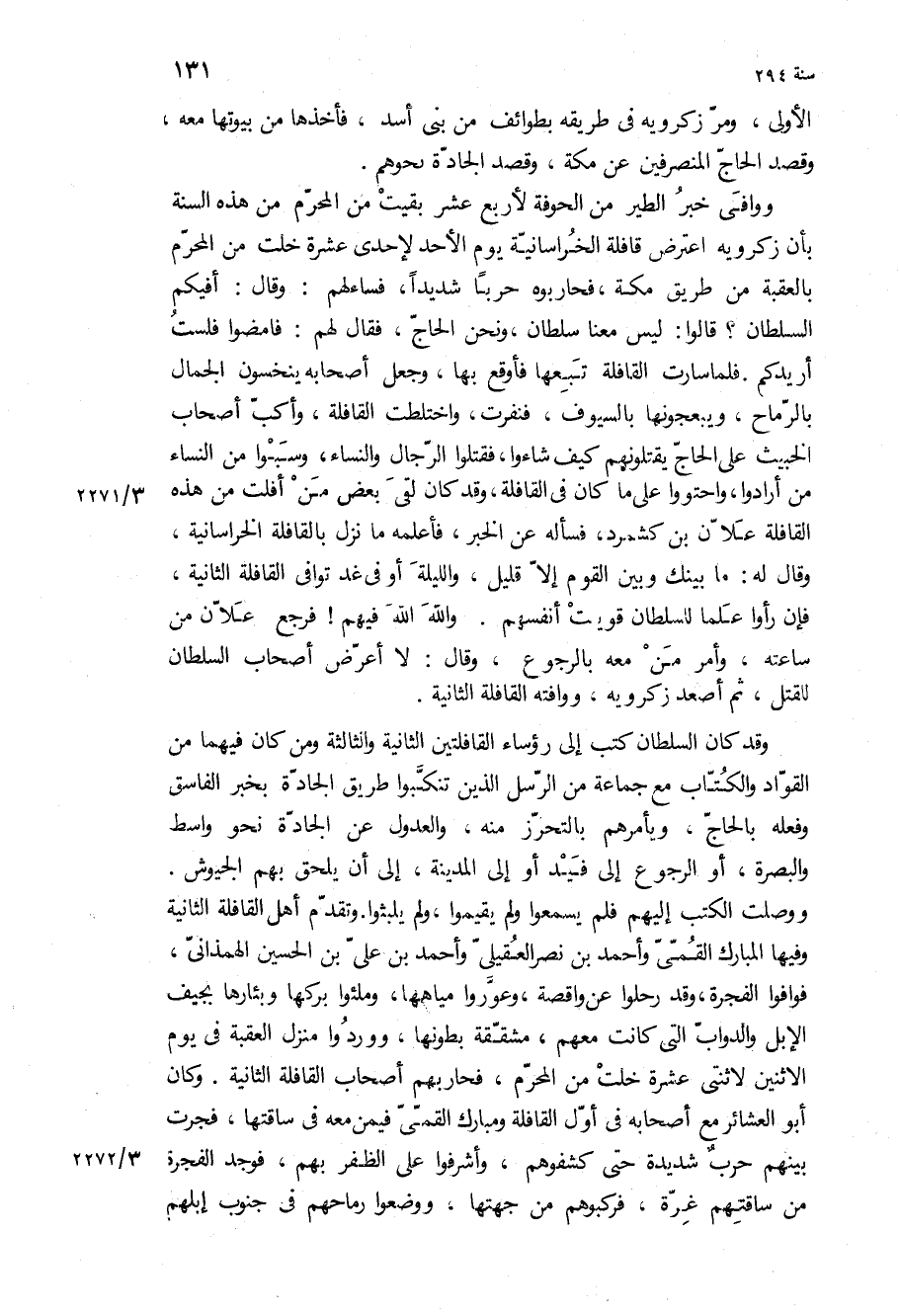 ووافى خبر الطير من الحوفه لاربع عشر بقيت من المحرم من هذه السنه بان زكرويه اعترض قافلة الخراسانيه يوم الأحد لإحدى عشره خلت من المحرم بالعقبه من طريق مكة، فحاربوه حربا شديدا، فساءلهم: وقال: افيكم السلطان؟ قالوا: ليس معنا سلطان، ونحن الحاج، فقال لهم: فامضوا فلست أريدكم فلما سارت القافلة تبعها فاوقع بها، وجعل اصحابه ينخسون الجمال بالرماح، ويبعجونها بالسيوف، فنفرت، واختلطت القافلة، وأكب اصحاب الخبيث على الحاج يقتلونهم كيف شاءوا، فقتلوا الرجال والنساء، وسبوا من النساء من أرادوا، واحتووا على ما كان في القافلة، وقد كان لقى بعض من افلت من هذه القافلة علان بن كشمرد، فسأله عن الخبر، فاعلمه ما نزل بالقافلة الخراسانيه، وقال له: ما بينك وبين القوم الا قليل، والليلة او في غد توافى القافلة الثانيه، فان رأوا علما للسلطان قويت انفسهم والله الله فيهم! فرجع علان من ساعته، وامر من معه بالرجوع، وقال: لا اعرض اصحاب السلطان للقتل، ثم اصعد زكرويه، ووافته القافلة الثانيه.