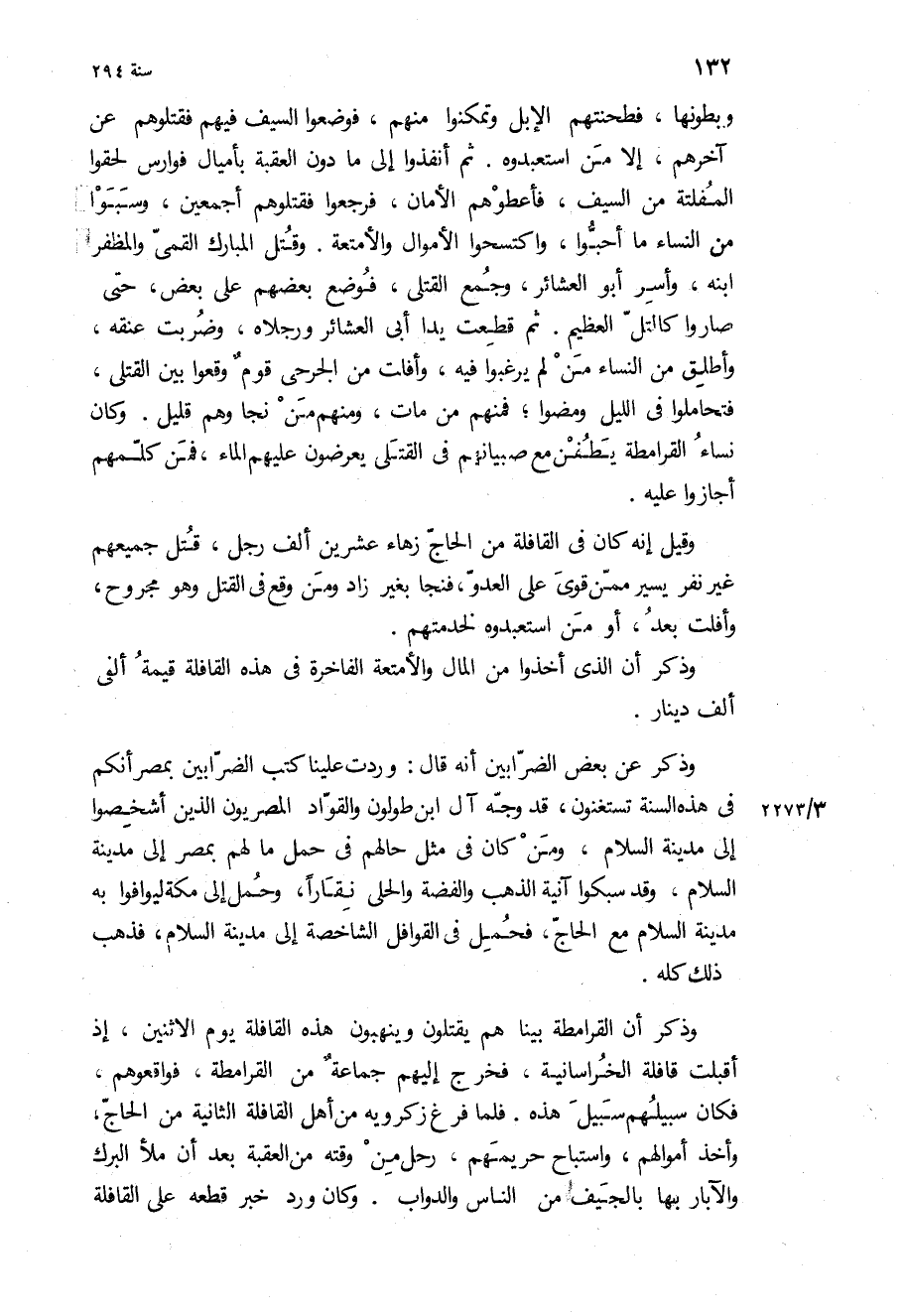 وذكر ان القرامطة بينا هم يقتلون وينهبون هذه القافلة يوم الاثنين، إذ اقبلت قافلة الخراسانيه، فخرج اليهم جماعه من القرامطة، فواقعوهم، فكان سبيلهم سبيل هذه فلما فرغ زكرويه من اهل القافلة الثانيه من الحاج.