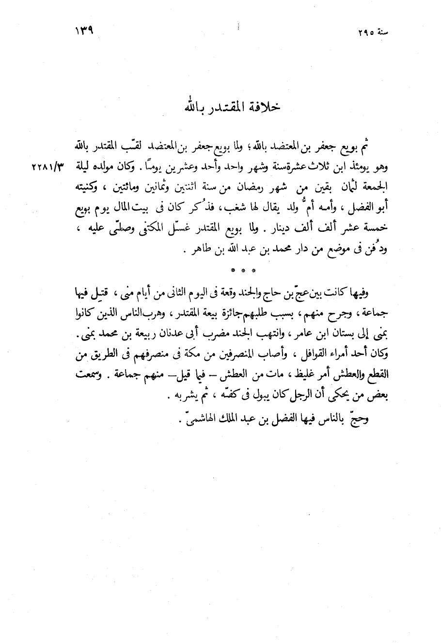 ثم بويع جعفر بن المعتضد بالله، ولما بويع جعفر بن المعتضد لقب المقتدر بالله وهو يومئذ ابن ثلاث عشره سنه وشهر واحد واحد وعشرين يوما وكان مولده ليله الجمعه لثمان بقين من شهر رمضان من سنه اثنتين وثمانين ومائتين، وكنيته ابو الفضل، وأمه أم ولد يقال لها شغب، فذكر كان في بيت المال يوم بويع خمسه عشر الف الف دينار ولما بويع المقتدر غسل المكتفي وصلى عليه، ودفن في موضع من دار محمد بن عبد الله بن طاهر.