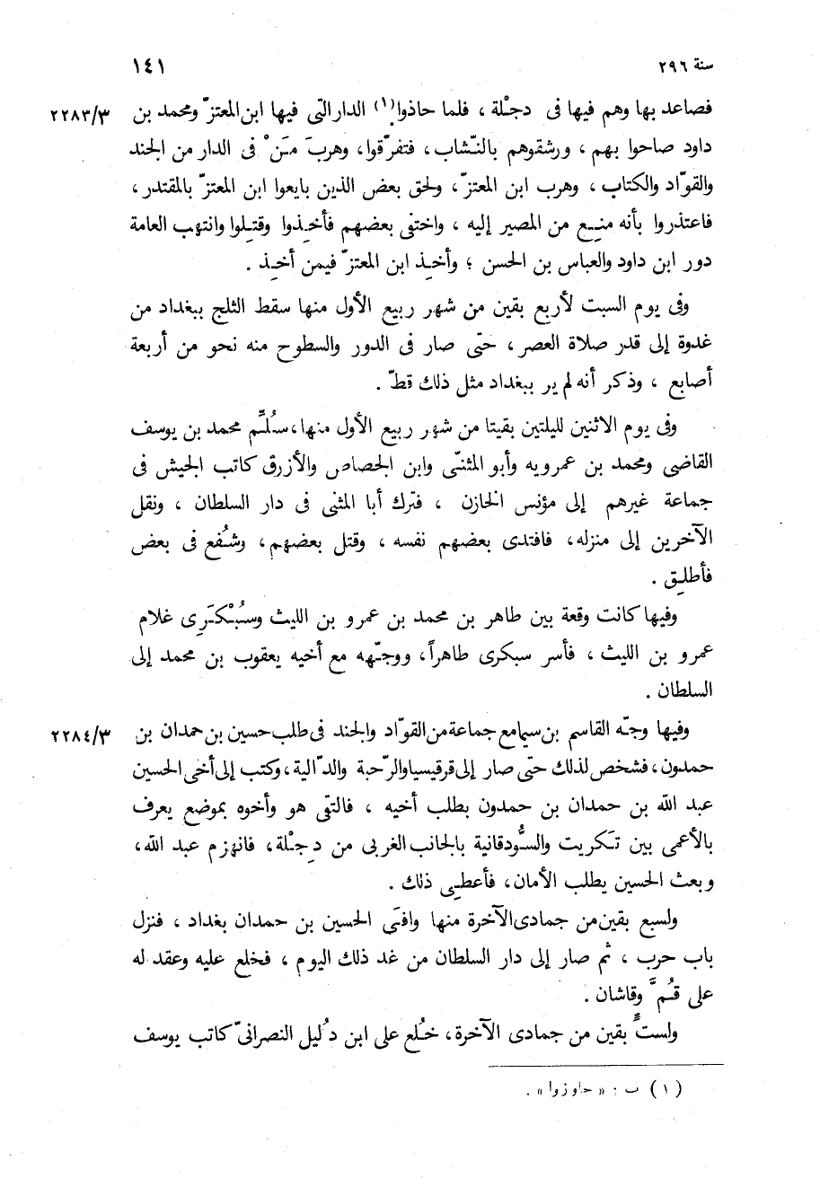 فصاعد بها وهم فيها في دجلة، فلما حاذوا الدار التي فيها ابن المعتز ومحمد بن داود صاحوا بهم، ورشقوهم بالنشاب، فتفرقوا، وهرب من في الدار من الجند والقواد والكتاب، وهرب ابن المعتز، ولحق بعض الذين بايعوا ابن المعتز بالمقتدر، فاعتذروا بانه منع من المصير اليه، واختفى بعضهم فأخذوا وقتلوا وانتهب العامه دور ابن داود والعباس بن الحسن، وأخذ ابن المعتز فيمن أخذ.