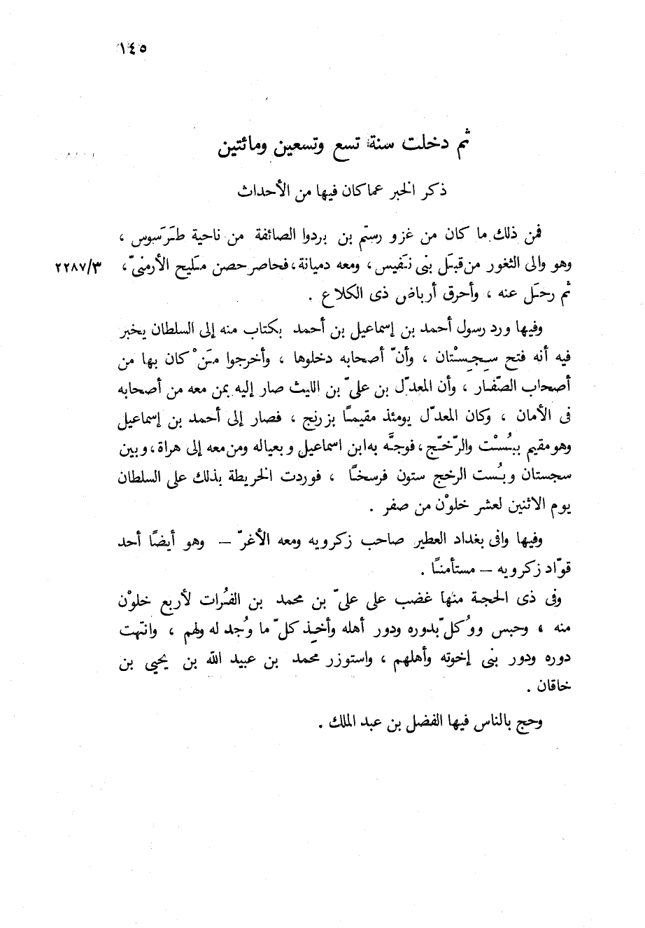 وهو والى الثغور من قبل بنى نفيس، ومعه دميانه فحاصر حصن مليح الأرمني، ثم رحل عنه، واحرق ارباض ذي الكلاع وفيها ورد رسول احمد بن اسماعيل بن احمد بكتاب منه الى السلطان يخبر فيه انه فتح سجستان، وان اصحابه دخلوها، واخرجوا من كان بها من اصحاب الصفار، وان المعدل بن على بن الليث صار اليه بمن معه من اصحابه في الامان، وكان المعدل يومئذ مقيما بزرنج، فصار الى احمد بن اسماعيل وهو مقيم ببست والرخج، فوجه به ابن اسماعيل وبعياله ومن معه الى هراة، وبين سجستان وبست الرخج ستون فرسخا، فوردت الخريطة بذلك على السلطان يوم الاثنين لعشر خلون من صفر.