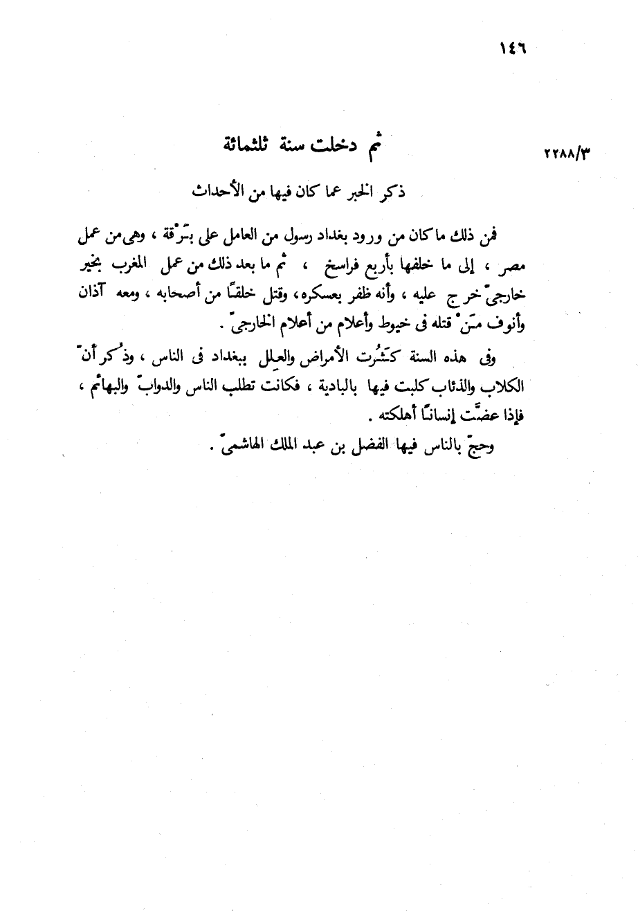 (ذكر الخبر عما كَانَ فِيهَا من الأحداث) فمن ذلك ما كان من ورود بغداد رسول من العامل على برقه، وهي من عمل مصر، الى ما خلفها باربع فراسخ، ثم ما بعد ذلك من عمل المغرب بخبر خارجى خرج عليه، وانه ظفر بعسكره، وقتل خلقا من اصحابه، ومعه آذان وانوف من قتله في خيوط واعلام من اعلام الخارجي وفي هذه السنه كثرت الامراض والعلل ببغداد في الناس، وذكر ان الكلاب والذئاب كلبت فيها بالبادية، فكانت تطلب الناس والدواب والبهائم، فإذا عضت إنسانا اهلكته.