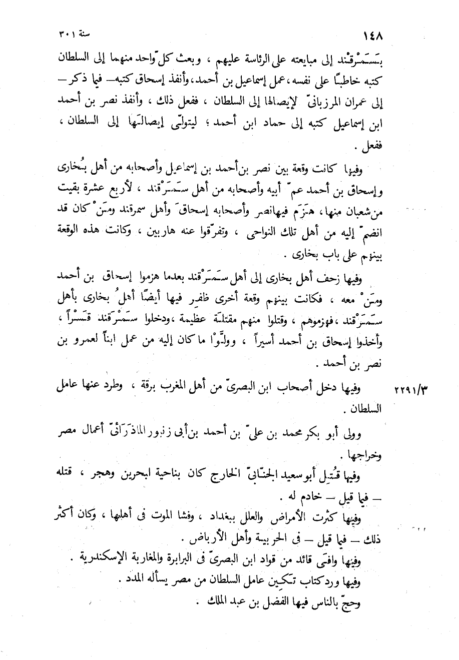 وفيها كانت وقعه بين نصر بن احمد بن اسماعيل واصحابه من اهل بخارى وإسحاق بن احمد عم ابيه واصحابه من اهل سمرقند، لاربع عشره بقيت من شعبان منها، هزم فيها نصر واصحابه إسحاق واهل سمرقند ومن كان قد انضم اليه من اهل تلك النواحي، وتفرقوا عنه هاربين، وكانت هذه الوقعه بينهم على باب بخارى وفيها زحف اهل بخارى الى اهل سمرقند بعد ما هزموا إسحاق بن احمد ومن معه، فكانت بينهم وقعه اخرى ظفر فيها أيضا اهل بخارى باهل سمرقند، فهزموهم، وقتلوا منهم مقتله عظيمه، ودخلوا سمرقند قسرا، وأخذوا إسحاق بن احمد أسيرا، وولوا ما كان اليه من عمل ابنا لعمرو بن نصر بن احمد.