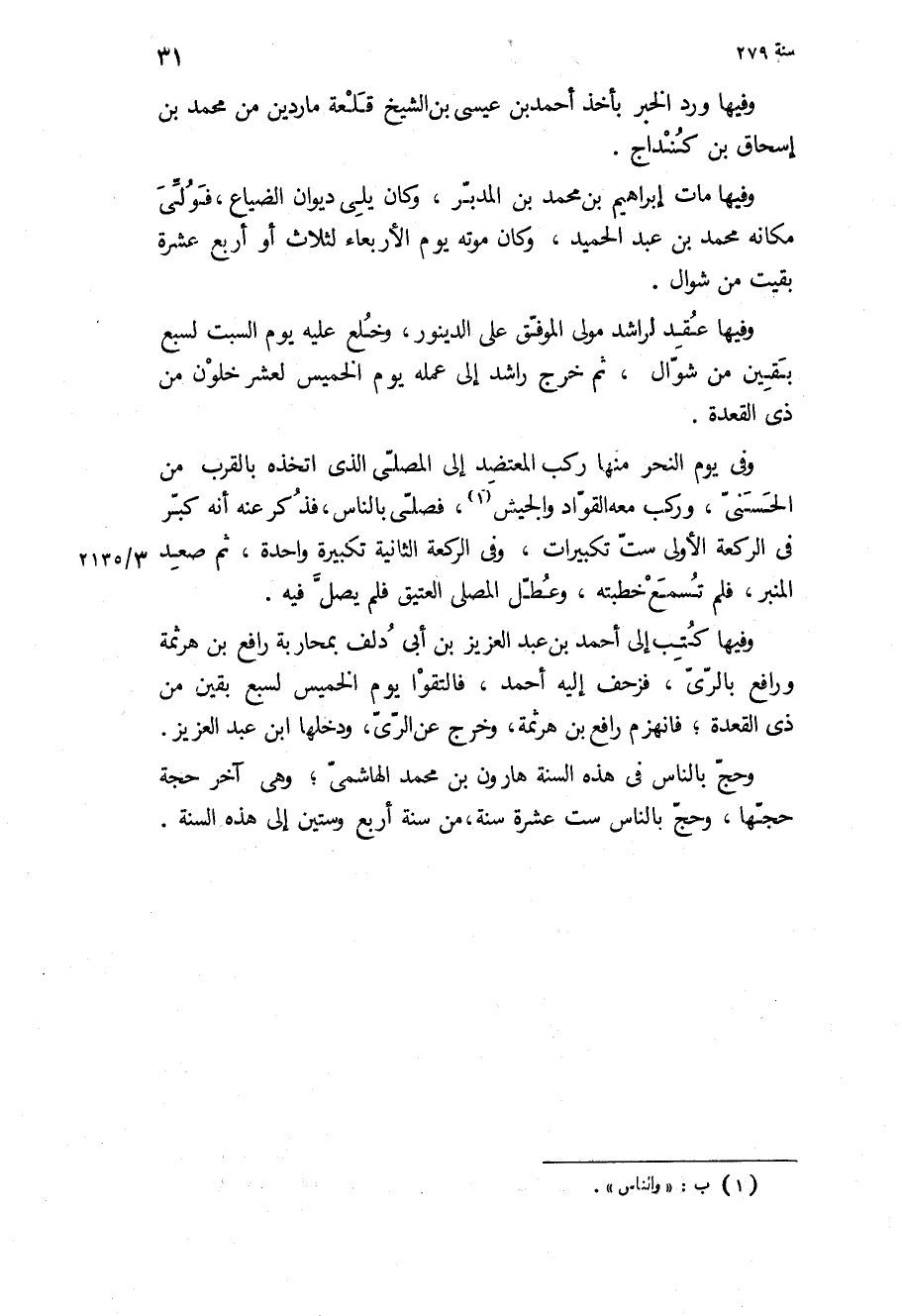 وفي يوم النحر منها ركب المعتضد الى المصلى الذى اتخذه بالقرب من الحسنى، وركب معه القواد والجيش فصلى بالناس، فذكر عنه انه كبر في الركعة الاولى ست تكبيرات، وفي الركعة الثانيه تكبيره واحده، ثم صعد المنبر، فلم تسمع خطبته، وعطل المصلى العتيق فلم يصل فيه.