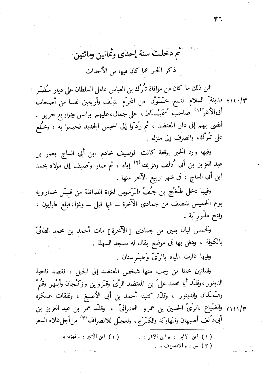 فمن ذلك ما كان من موافاه ترك بن العباس عامل السلطان على ديار مضر مدينه السلام لتسع خلون من المحرم بنيف واربعين نفسا من اصحاب ابى الأغر صاحب سميساط، على جمال، عليهم برانس ودراريع حرير.