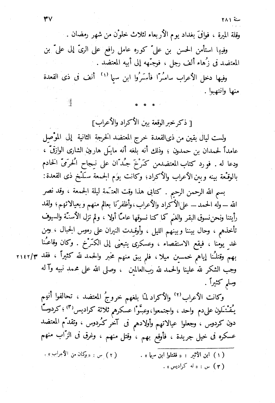 بسم الله الرحمن الرحيم كتابي هذا وقت العتمه ليله الجمعه، وقد نصر الله- وله الحمد- على الأكراد والاعراب، واظفرنا بعالم منهم وبعيالاتهم، ولقد رايتنا ونحن نسوق البقر والغنم كما كنا نسوقها عاما أولا، ولم تزل الأسنة والسيوف تأخذهم، وحال بيننا وبينهم الليل، واوقدت النيران على رءوس الجبال، ومن غد يومنا، فيقع الاستقصاء، وعسكرى يتبعني الى الكرخ وكان وقاعنا بهم وقتلنا إياهم خمسين ميلا، فلم يبق منهم مخبر والحمد لله كثيرا، فقد وجب الشكر لله علينا والحمد لله رب العالمين، وصلى الله على محمد نبيه وآله وسلم كثيرا.