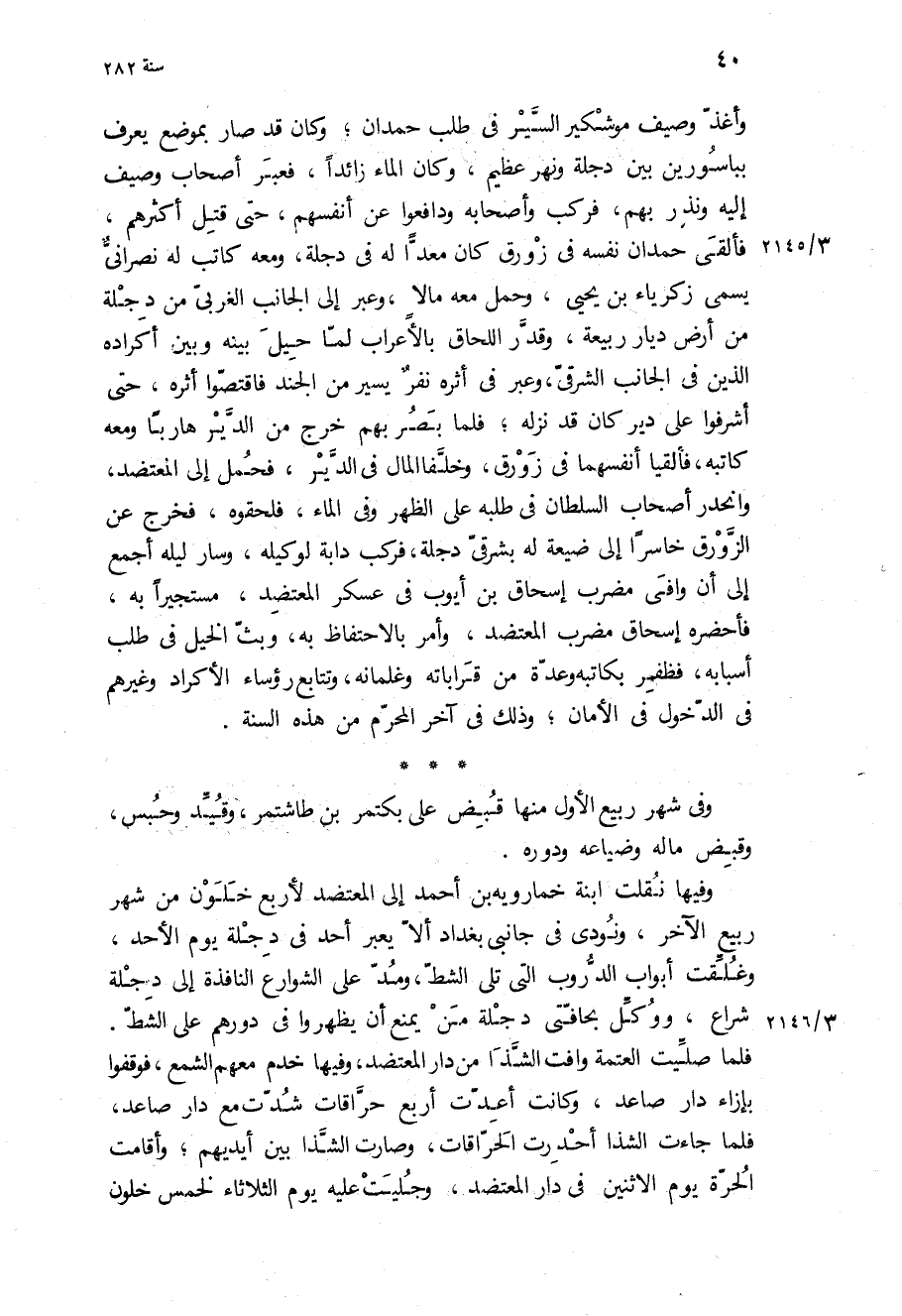 فلما صليت العتمه وافت الشذا من دار المعتضد، وفيها خدم معهم الشمع، فوقفوا بإزاء دار صاعد، وكانت اعدت اربع حراقات شدت مع دار صاعد، فلما جاءت الشذا احدرت الحراقات، وصارت الشذا بين ايديهم، واقامت الحره يوم الاثنين في دار المعتضد، وجليت عليه يوم الثلاثاء لخمس خلون