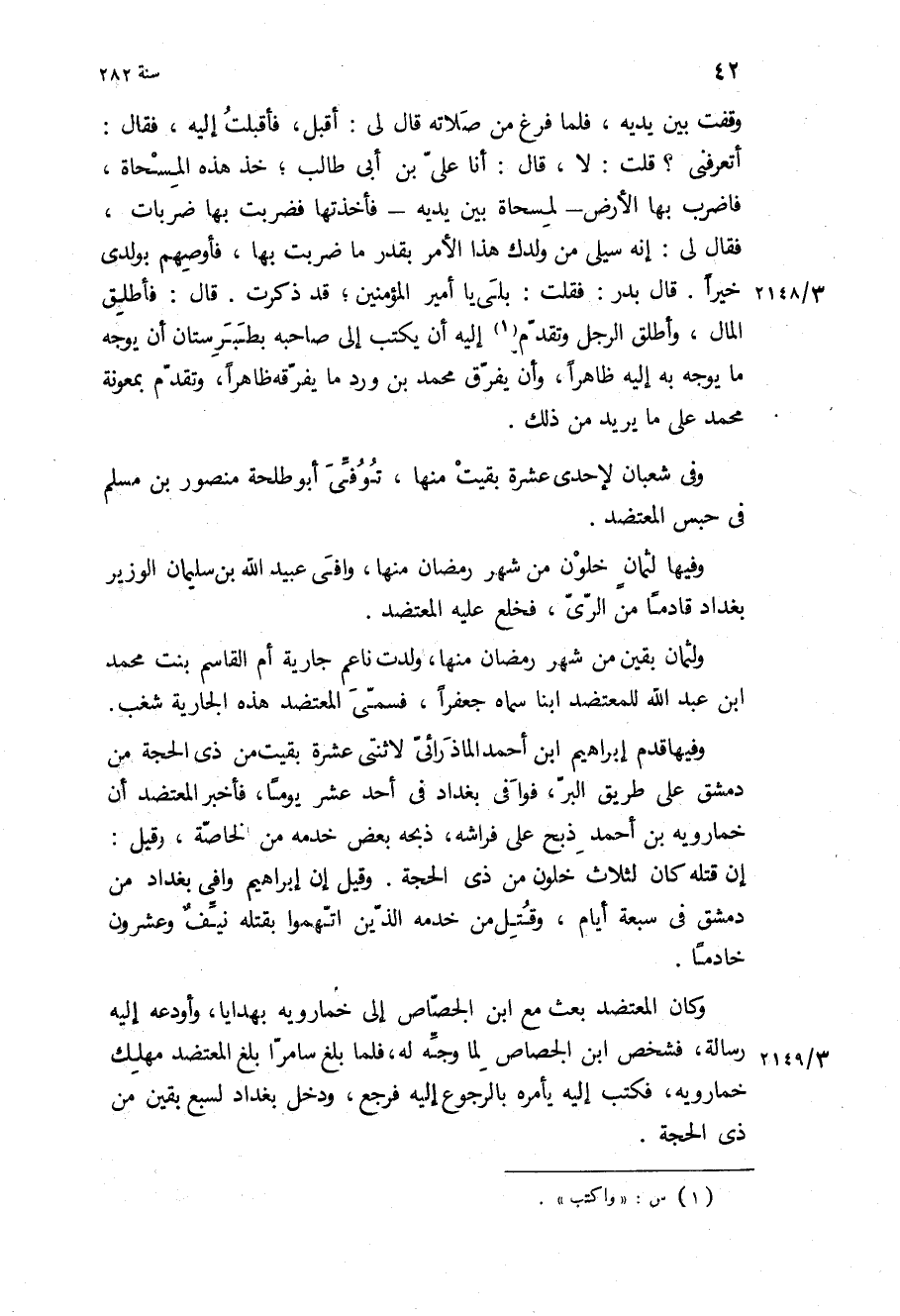 وفي شعبان لإحدى عشره بقيت منها، توفى ابو طلحه منصور بن مسلم في حبس المعتضد وفيها لثمان خلون من شهر رمضان منها، وافى عبيد الله بن سليمان الوزير بغداد قادما من الري، فخلع عليه المعتضد.
