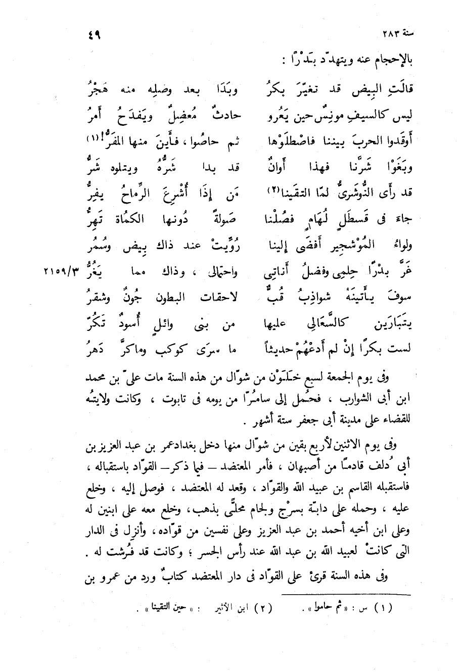 وفي يوم الاثنين لاربع بقين من شوال منها دخل بغداد عمر بن عبد العزيز بن ابى دلف قادما من أصبهان، فامر المعتضد- فيما ذكر- القواد باستقباله، فاستقبله القاسم بن عبيد الله والقواد، وقعد له المعتضد، فوصل اليه، وخلع عليه، وحمله على دابه بسرج ولجام محلى بذهب، وخلع معه على ابنين له وعلى ابن أخيه احمد بن عبد العزيز وعلى نفسين من قواده، وانزل في الدار التي كانت لعبيد الله بن عبد الله عند راس الجسر، وكانت قد فرشت له.