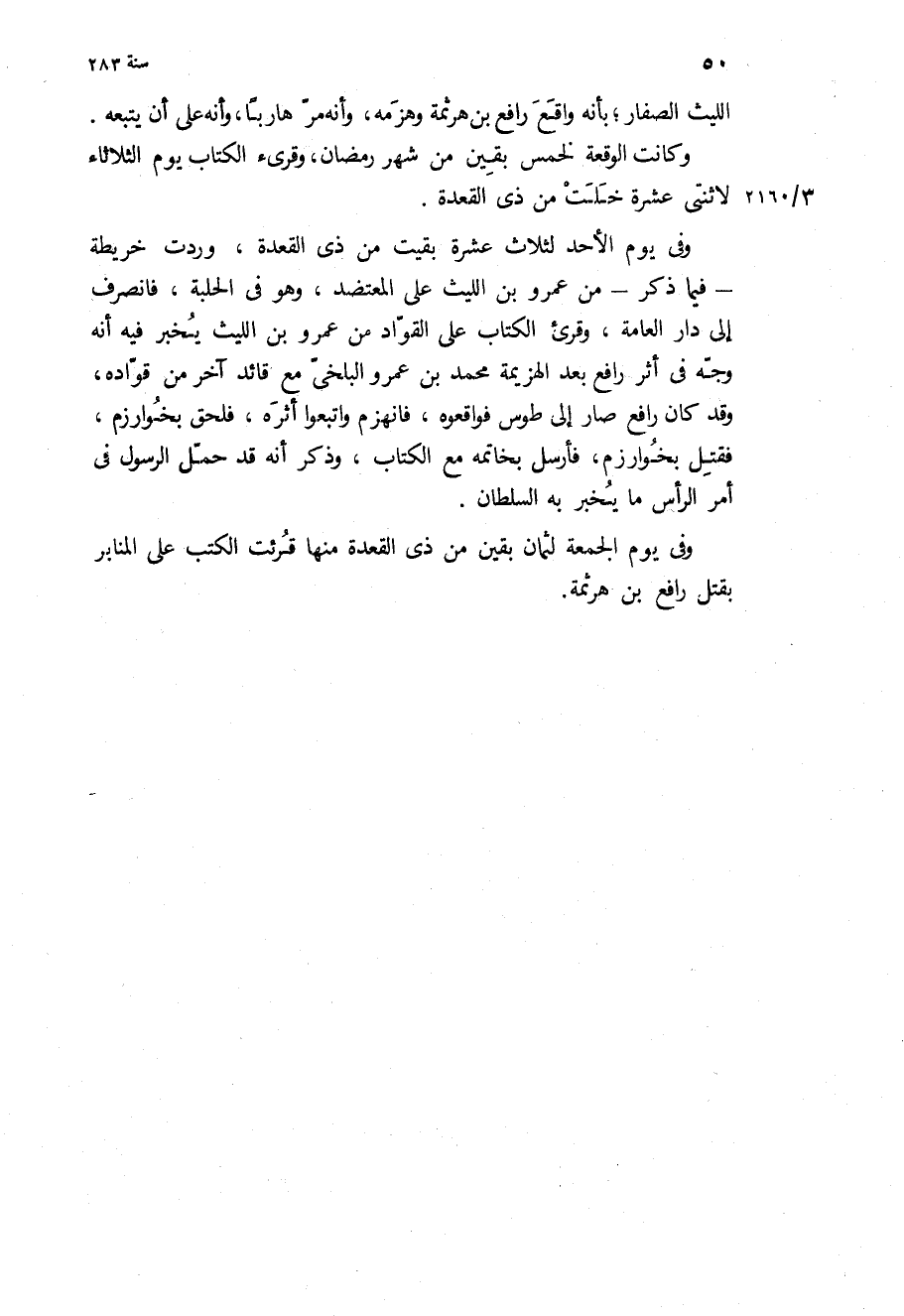 وفي يوم الأحد لثلاث عشره بقيت من ذي القعده، وردت خريطة- فيما ذكر- من عمرو بن الليث على المعتضد، وهو في الحلبه، فانصرف الى دار العامه، وقرئ الكتاب على القواد من عمرو بن الليث يخبر فيه انه وجه في اثر رافع بعد الهزيمة محمد بن عمرو البلخى مع قائد آخر من قواده، وقد كان رافع صار الى طوس فواقعوه، فانهزم واتبعوا اثره، فلحق بخوارزم، فقتل بخوارزم فأرسل بخاتمه مع الكتاب، وذكر انه قد حمل الرسول في امر الراس ما يخبر به السلطان.