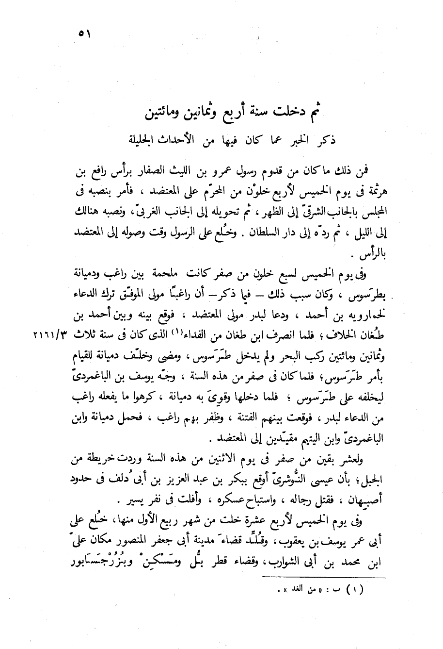 فمن ذلك ما كان من قدوم رسول عمرو بن الليث الصفار برأس رافع بن هرثمة في يوم الخميس لاربع خلون من المحرم على المعتضد، فامر بنصبه في المجلس بالجانب الشرقى الى الظهر، ثم تحويله الى الجانب الغربي، ونصبه هنالك الى الليل، ثم رده الى دار السلطان وخلع على الرسول وقت وصوله الى المعتضد بالراس.