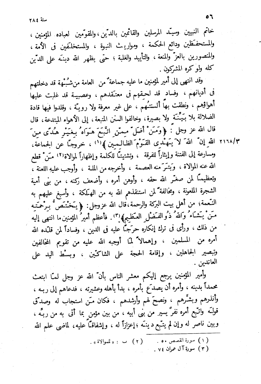 وقد انتهى الى امير المؤمنين ما عليه جماعه من العامه من شبهه قد دخلتهم في اديانهم، وفساد قد لحقهم في معتقدهم، وعصبية قد غلبت عليها اهواؤهم، ونطقت بها السنتهم، على غير معرفه ولا رويه، وقلدوا فيها قاده الضلالة بلا بينه ولا بصيره، وخالفوا السنن المتبعه، الى الأهواء المبتدعه، قال قَالَ الله عز وجل: «وَمَنْ أَضَلُّ مِمَّنِ اتَّبَعَ هَواهُ بِغَيْرِ هُدىً مِنَ اللَّهِ إِنَّ اللَّهَ لا يَهْدِي الْقَوْمَ الظَّالِمِينَ» ، خروجا عن الجماعه، ومسارعه الى الفتنة وإيثارا للفرقة، وتشتيتا للكلمة وإظهارا لموالاة من قطع الله عنه الموالاة، وبتر منه العصمة، واخرجه من الملة، واوجب عليه اللعنه، وتعظيما لمن صغر الله حقه، واوهن امره، واضعف ركنه، من بنى اميه الشجرة الملعونه، ومخالفه لمن استنقذهم الله به من الهلكة، واسبغ عليهم به النعمه، من اهل بيت البركه والرحمه، قال الله عز وجل: «يَخْتَصُّ بِرَحْمَتِهِ مَنْ يَشاءُ وَاللَّهُ ذُو الْفَضْلِ الْعَظِيمِ*» فأعظم امير المؤمنين ما انتهى اليه من ذلك، وراى في ترك إنكاره حرجا عليه في الدين، وفسادا لمن قلده الله امره من المسلمين، وإهمالا لما أوجبه الله عليه من تقويم المخالفين وتبصير الجاهلين، واقامه الحجه على الشاكين، وبسط اليد على العاندين.