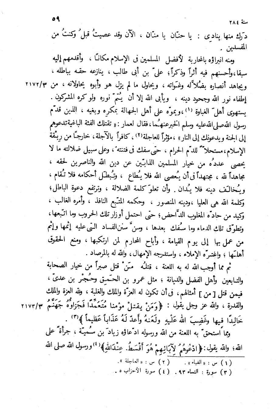 ثم مما اوجب الله له به اللعنه، قتله من قتل صبرا من خيار الصحابه والتابعين واهل الفضل والديانه، مثل عمرو بن الحمق وحجر بن عدى، فيمن قتل من أمثالهم، في ان تكون له العزه والملك والغلبه، ولله العزه والملك والقدره، والله عز وجل يقول: «وَمَنْ يَقْتُلْ مُؤْمِناً مُتَعَمِّداً فَجَزاؤُهُ جَهَنَّمُ خالِداً فِيها وَغَضِبَ اللَّهُ عَلَيْهِ وَلَعَنَهُ وَأَعَدَّ لَهُ عَذاباً عَظِيماً.»